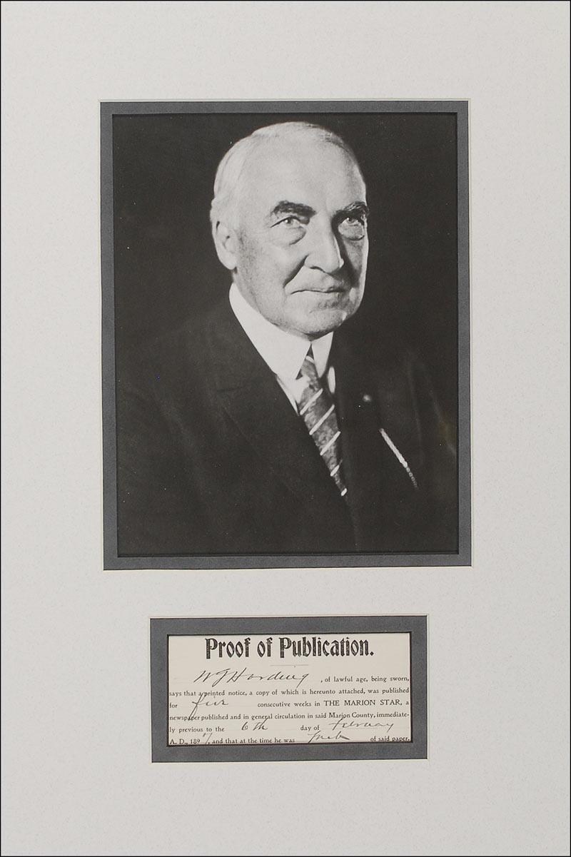 Partial partly-printed DS, signed “W. G. Harding,” one page, 5 x 2.25, February 6, 1897. A “proof of publication” for a notice that appeared for five weeks in the Marion Star. Double matted, with a portrait of Harding, to an overall size of 12 x 18. In fine condition.
