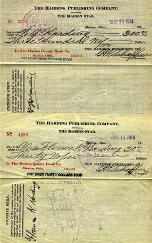 Warren G. and Florence K. Harding. Two checks, one to Warren, 1914, for $300, the other to Florence, 1915, for $30. Each has endorsed check on attached voucher. Checks imprinted "Harding Publishing Co...The Marion Star," his newspaper. Dark signatures. A small ink blot on each, else about fine. Nice pair.