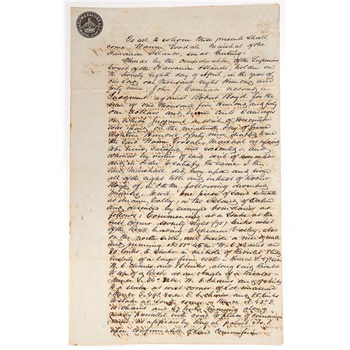 <Our item number 139978><B>Goodale, Warren, Marshall of the Hawaiian Islands- Land Deed.</B> 12½ x 8 in., 1849, August 18, 4 pp. A property referred to as the "Boyd lot" in "Nuanu Valley" is sold to Ashur B. Bates at a public auction by Warren Goodale. Document has Royal Stamp (ink) and is signed by Ashur B. Bates; Warren Goodale (as Marshall of the Hawaiian Islands); John R. Jasper (as Registrar of Conveyances); Richard Armstrong (as Witness). Some script bleed through. <BR>Estimated Value $400 - 600. <BR><BR>Our item number 139978<BR><IMAGES><P ALIGN="CENTER"><IMG SRC="http://www.goldbergcoins.net/liveauction/49jpegs/139978.jpg"> </P></IMAGES>