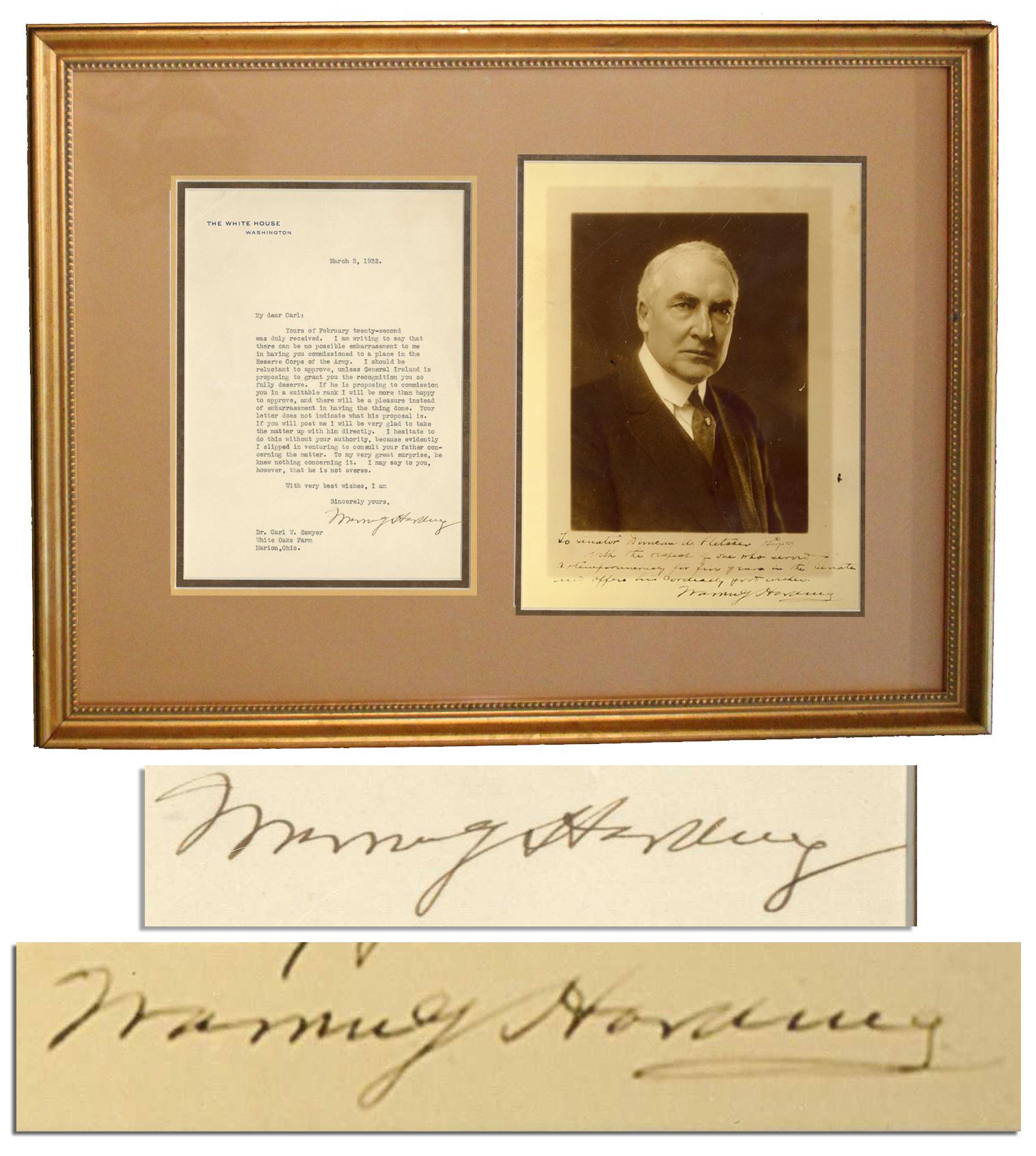 Warren Harding typed letter signed as President, dated 2 March 1922 on White House stationery. Letter is addressed to Dr. Carl Sawyer and discusses a military promotion: ''…there can be no possible embarrassment to me in having you commissioned to a place in the Reserve Corps of the Army. I should be reluctant to approve, unless General Ireland is proposing to grant you the recognition you so fully deserve…'' Signed: ''Warren G Harding''. Letter measures 6'' x 8.25'' and is framed with a photo to an overall size of 21.5'' x 16''. Near fine.