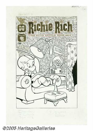 <B>Warren Kremer - Richie Rich #4 Cover Original Art (Harvey, 1961).</B></I> In November 1960, Harvey began publishing <B>Richie Rich</B></I>, a book which was an instant hit with the fans and eventually became a gold mine for the company. Many other series and spin-offs featuring the character have been published since. This nugget is a very early cover of <B>Richie Rich</B></I>, drawn by the artist most commonly associated with the character -- Warren Kremer. The overall size is 9.5" x 14" with a 7" x 10.5" image area. The art shows some slight signs of aging, especially along the top area behind the logo and indicia paste-ups. Still, none of this detracts from the wealth of charm and eye-appeal of this rare gem. A real prize for fans of the poor little rich boy, this is the earliest <B>Richie Rich</B></I> cover known to exist!