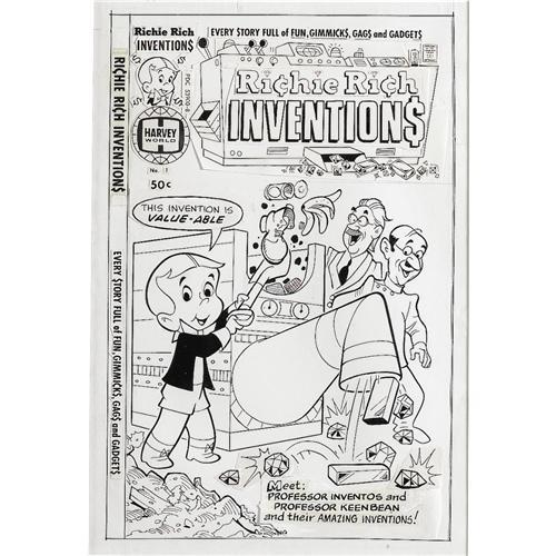Professors Inventos and Keenbean introduce Richie to their "value-able" device that turns trash into treasure, in this inventive cover illustration by Warren Kremer. The image area measures 7" x 10.25", and the art includes all the original logo and masthead paste-up copy. In Excellent condition.<BR><BR><BR><b>Shipping:</b> Framed (<a target="_blank" href="http://www.heritageauctions.com/common/shipping.php">view shipping information</a>)