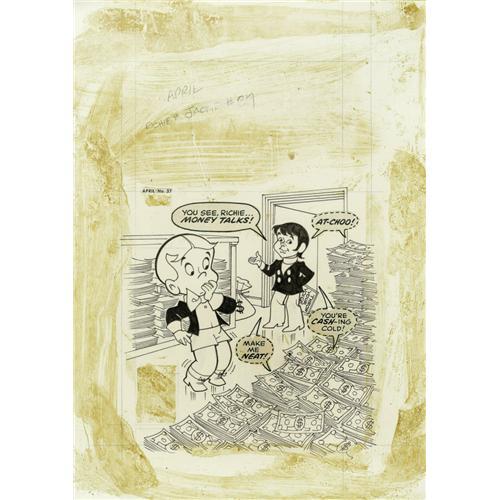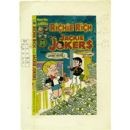 <B>Warren Kremer - Richie Rich and Jackie Jokers #37 Cover and Color Guide Original Art (Harvey, 1980).</B></I> Money talks, literally, in this cover illustration by Warren Kremer. The image area measures 7" x 7". There is some aging apparent, and glue staining on all four edges of the art, with some scattered staining inside the image area; otherwise the condition is Good. Includes a hand-colored color guide of the cover, with color notations and deadline notes, in Very Good condition.