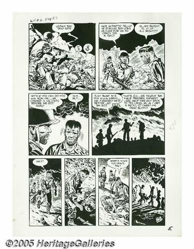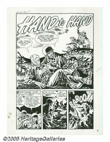 <B>Warren Kremer - Warfront #8, Complete 5-page Story "Hand to Hand" Original Art (Harvey, 1952).</B></I> "Spring... summer... winter... fall... a guy can get killed any time in Korea!" A pair of scouts on night patrol get ambushed; the cavalry's on the way -- but will they be in time? Blood-and-ink-soaked army action from one of Harvey's thrilling war books, with moody artwork and economical storytelling combined to make a riveting tale. The image area measures 12" x 18" and the artwork has some minor staining in the margins, otherwise the art is in Excellent condition