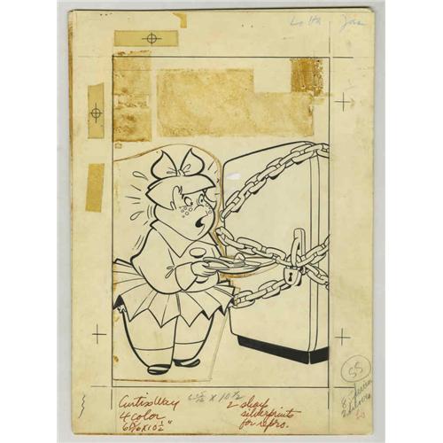 <B>Warren Kremer (attributed) - Little Lotta #2 Cover Original Art (Harvey, 1956).</B></I> The irrepressible Little Lotta finds herself facing a daunting scenario -- a padlocked refrigerator -- in this illustration created for her second issue ever! Our hefty heroine got her start in 1953 as a back-up feature to her best friend, <B>Little Dot</B></I>, and gobbled her way into her own series in 1955. The art was produced from several cut pieces glued together on one board, and has an image area of 7" x 10.5"; aside from some overall aging and scattered glue staining, the condition is Good. You're in for a whole "Lotta" fun, if you become the winner bidder on this delectable delineation!