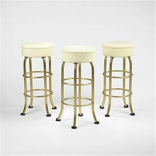 Warren McArthur stools, set of three Warren McArthur Corporation USA, 1930s anodized aluminum, vinyl, rubber 13.5"w x 13.5"d x 30.25"h Anodized color was available on all McArthur furniture, but was rarely ordered. This set is a rare example in yellow with original vinyl.