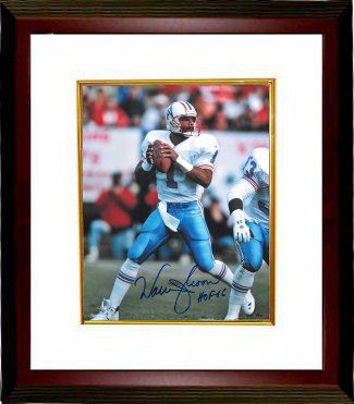 Warren Moon is one of only two people to be enshrined in both the Pro Football Hall of Fame and Canadian Football Hall of Fame. Moon held the record for most passing yardage in professional football until 2006. Warren Moon has hand autographed this Houston Oilers 8X10 Photo with HOF 06 inscription. Certificate of Authenticity from Athlon Sports. Custom White Mat and Premium Mahogany Frame as shown.