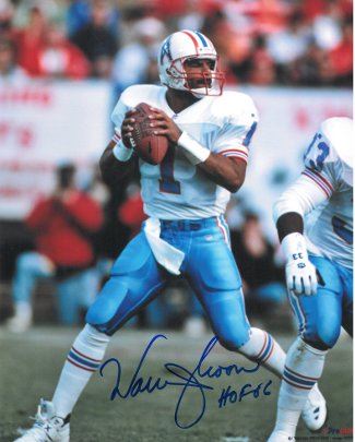 Warren Moon is one of only two people to be enshrined in both the Pro Football Hall of Fame and Canadian Football Hall of Fame. Moon held the record for most passing yardage in professional football until 2006. Warren Moon has hand autographed this Houston Oilers 8X10 Photo with HOF 06 inscription. Certificate of Authenticity from Athlon Sports.