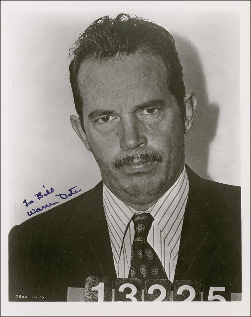 Glossy 8 x 10 photo of Oates as John Dillinger, signed and inscribed in black felt tip “To Bill, Warren Oates.” In fine condition, with a couple of small surface impressions.