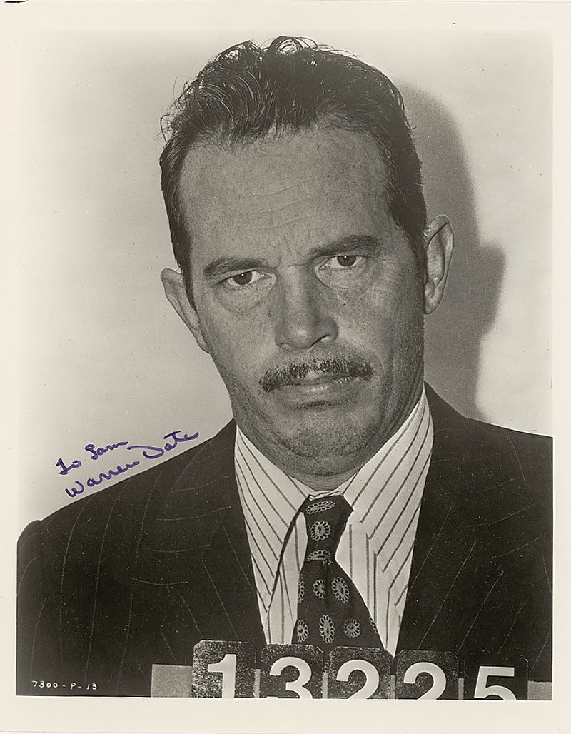 Glossy 8 x 10 photo of Oates as John Dillinger, signed and inscribed in black felt tip, “To Sam, Warren Oates.” In fine condition.