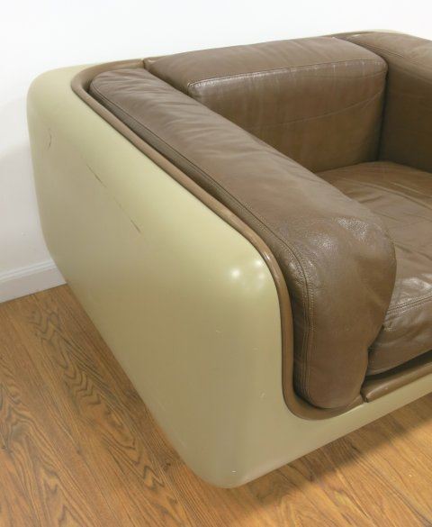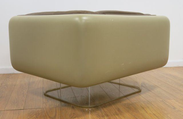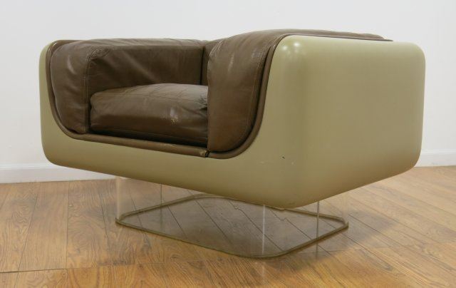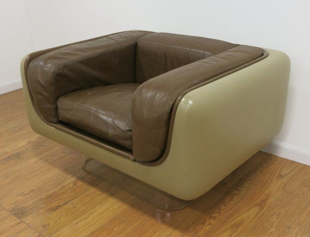 Coffee, Fiberglass & Lucite upholstery in leather. Approx. 25" H x 42" W x 32" D. Property from the office U. Kentucky Basketball Coach.