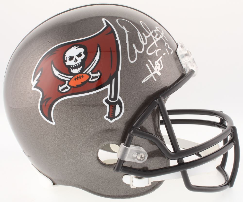Riddell Buccaneers full-size replica helmet. Hand-signed and inscribed in silver paint pen by Warren Sapp (HOF).