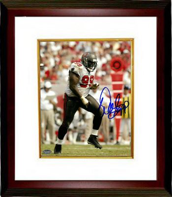 Warren Sapp Sapp played in the National Football League (NFL) from 1995 to 2007 for the Tampa Bay Buccaneers and Oakland Raiders. Sapp was drafted by the Buccaneers in the 1995 NFL Draft as the 12th overall pick. In his nine seasons with the Buccaneers, he earned seven trips to the Pro Bowl and a Super Bowl ring in 2002. In his first year of eligibility, on February 2, 2013, he was voted into the Pro Football Hall of Fame. Warren Sapp has hand signed this Tampa Bay Buccaneers 8x10 Photo. Schwartz Sports Hologram and Certificate of Authenticity from Athlon Sports. Custom White Mat and Premium Mahogany Frame as shown.