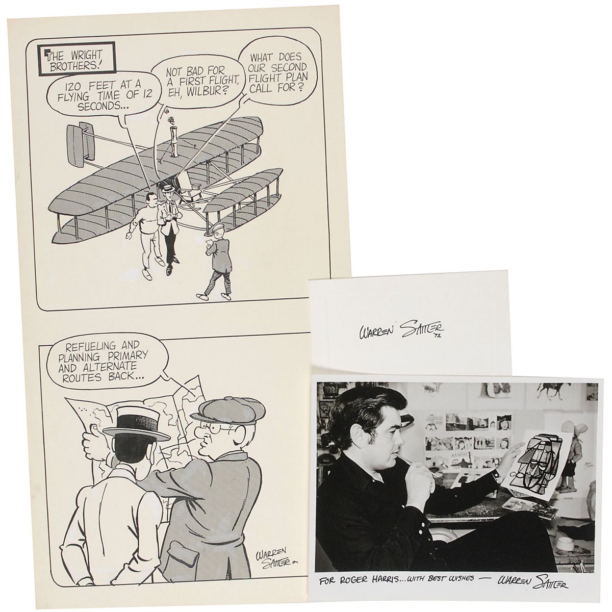Collection of three items: an original hand-inked two-panel comic strip of the Wright Brothers after their first flight, 9.5 x 17, signed in the second panel; a glossy 8.5 x 6.5 photo of Sattler, signed and inscribed in black felt tip; and an ink signature on a white double-weight 5.75 x 3.5 custom-made collector’s card (similar in look to an invitation card), dated 1972. In fine condition, with a central horizontal fold to strip.