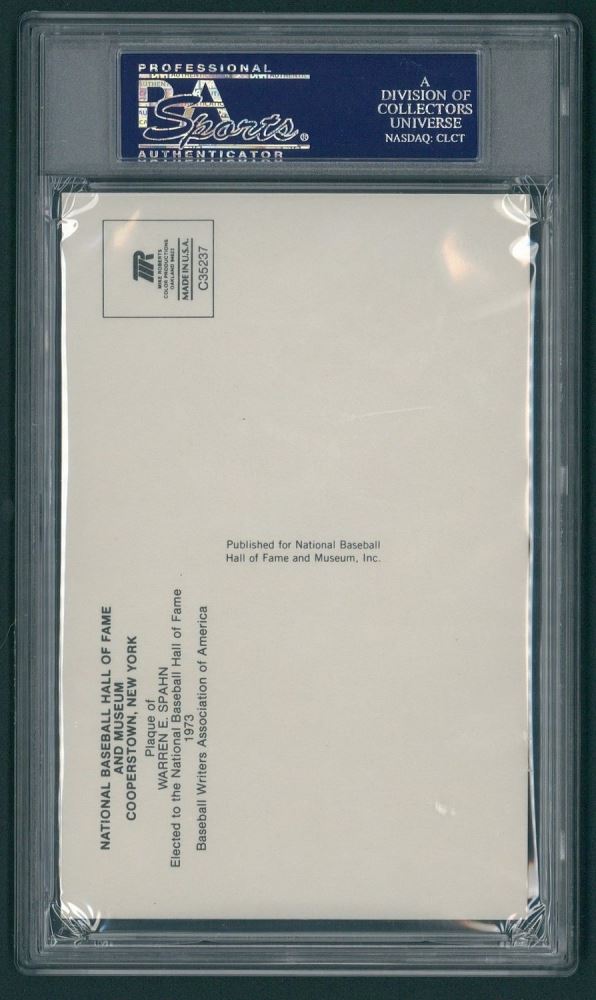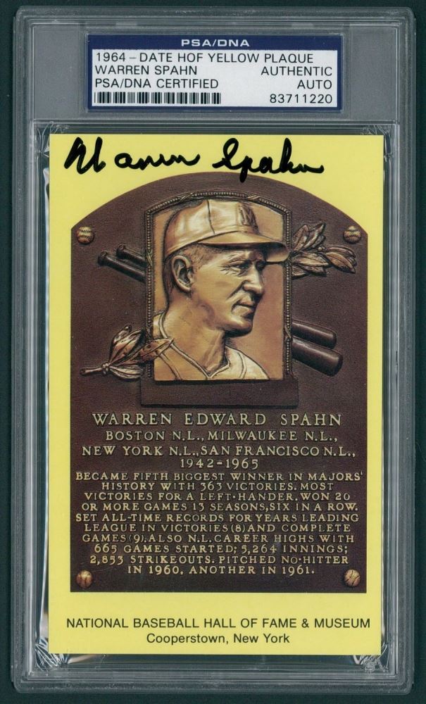 Hand-signed in black felt-tip pen by Warren Spahn (D 2003, Braves HOF). Autograph has been encapsulated by PSA for authenticity purposes.