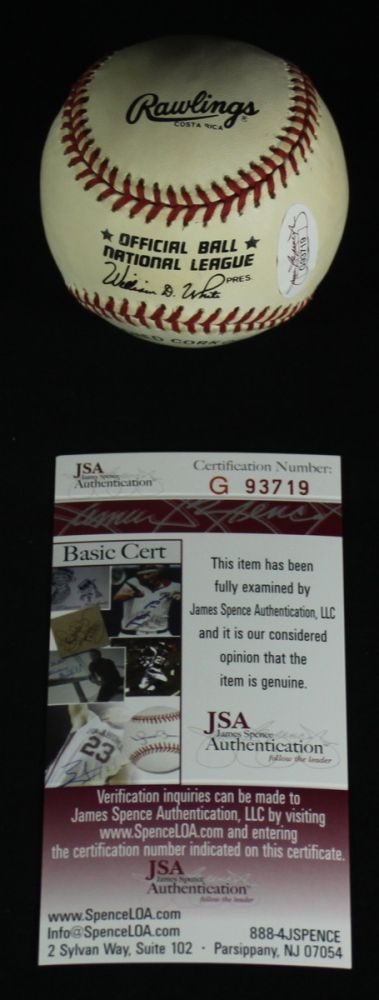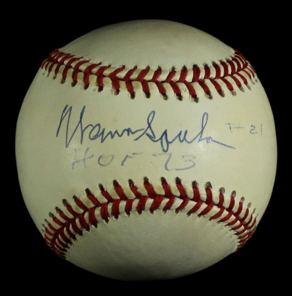 Official National League Baseball. Hand-signed and inscribed in blue ink by Warren Spahn (Braves HOF). Autograph includes a James Spence Authentication (JSA) hologram and matching COA for authenticity purposes.