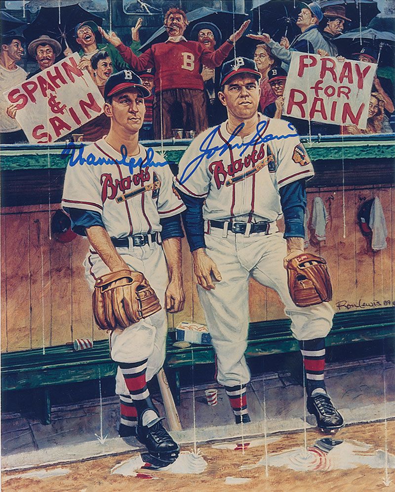 Color satin-finish 8 x 10 photo of an artist’s rendition of Spahn and Sain in the rain, signed in blue felt tip by both Warren Spahn and John Sain. In very fine condition.