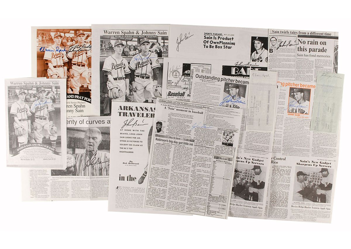 Thirteen items: cardstock 8 x 10 department store promotional photo, featuring an image of Spahn and Sain on the dugout steps, signed in blue felt tip by Spahn and signed and inscribed in black felt tip by Sain; a check endorsed by Sain; a check endorsed by Spahn; and ten photocopied articles from Sain’s personal archives, various sizes and lengths, each signed in felt tip by Sain. In very good condition.
