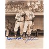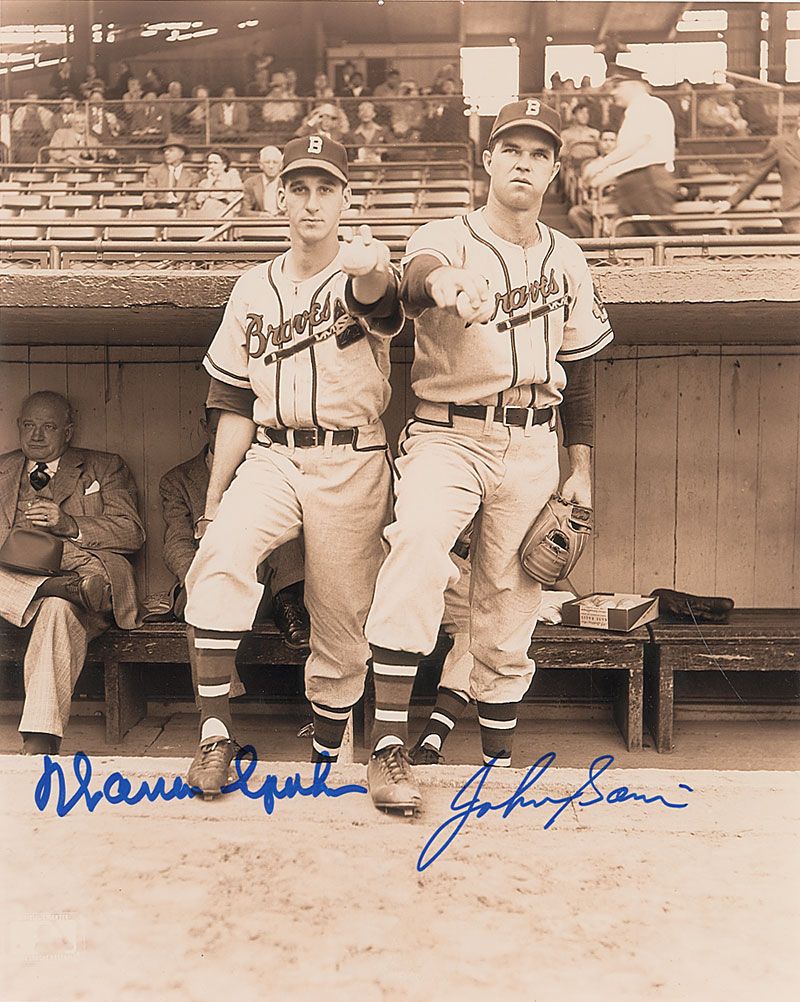 Glossy 8 x 10 photo of the Braves pitchers posing in front of their dugout, signed in blue felt tip by both Warren Spahn and John Sain. In fine condition.