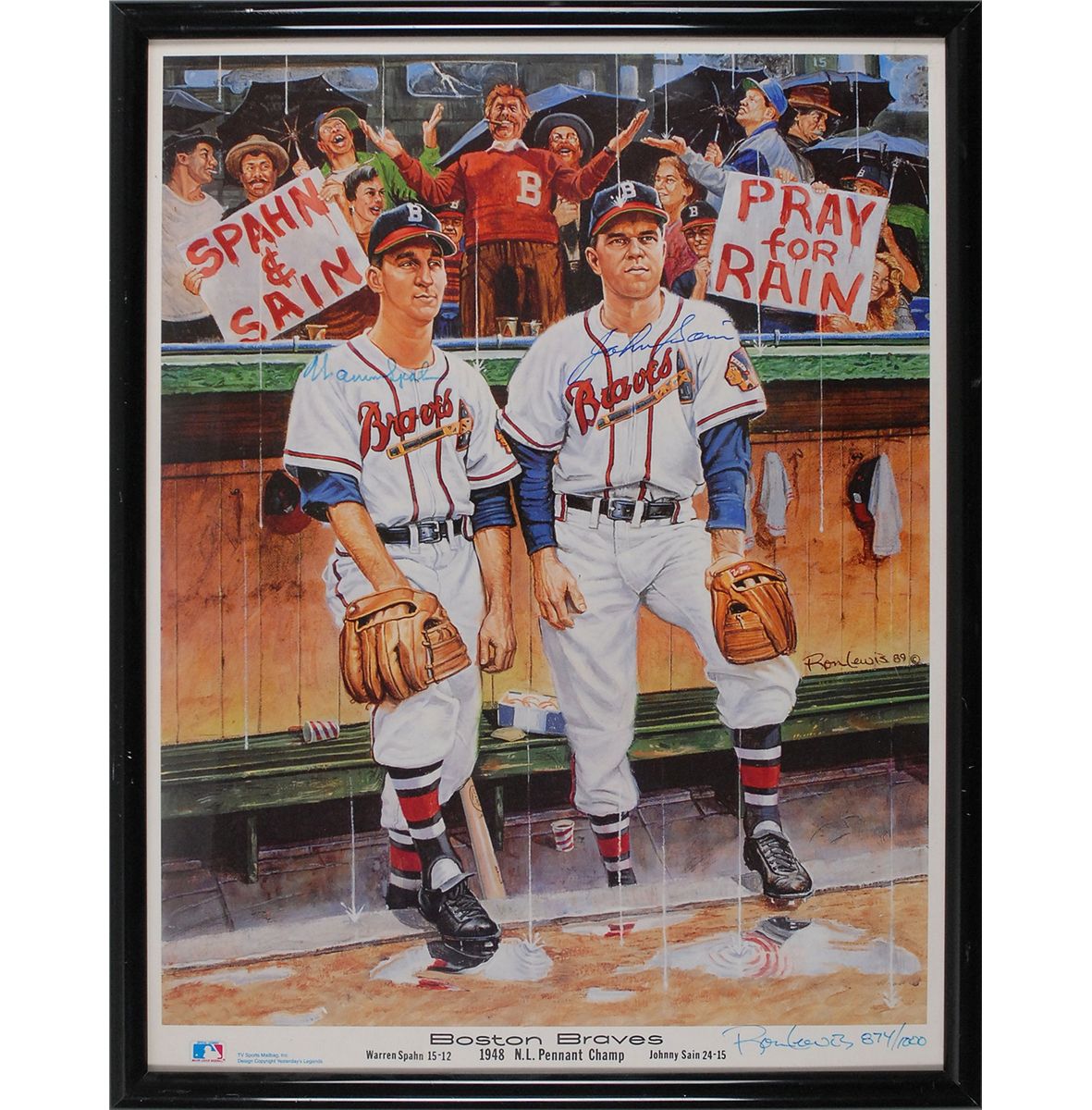 Color limited edition 16.5 x 21.5 print of Spahn and Sain standing in the rain in front of their dugout, numbered 874/1000, signed in blue felt tip. Also signed in felt tip by the artist, Ron Lewis. Framed to an overall size of 18.25 x 23.25. In fine condition, with Spahn’s signature a shade or two light.