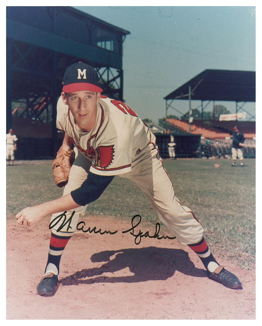 Color glossy 8 x 10 photo of Spahn warming up for the Milwaukee Braves, signed in black felt tip. In fine condition, with a few faint surface marks.