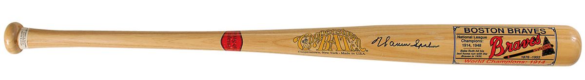 Official Cooperstown Bat Co. baseball bat commemorating the Boston Braves, signed in blue felt tip on the barrel. In fine condition.