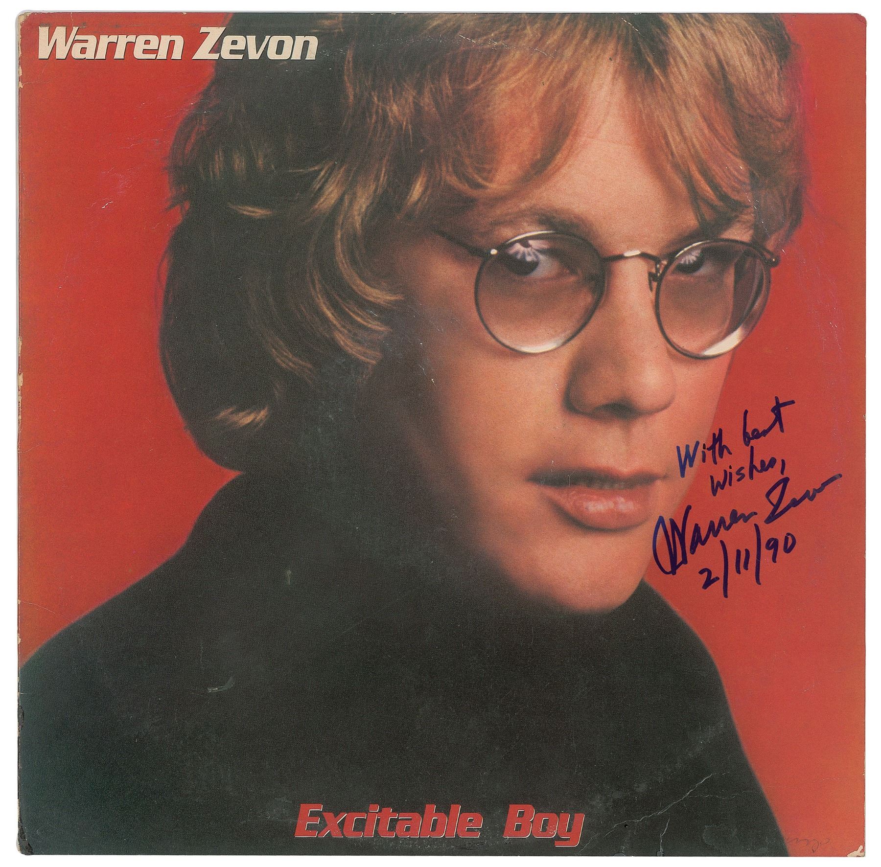 Excitable Boy album by Warren Zevon, signed on the front cover in blue felt tip, "With best wishes, Warren Zevon, 2/11/90." In fine condition, with light scuffing. The record is included. Consignor notes that this album was signed at the Stone Pony in Asbury Park, NJ, on February 11, 1990.