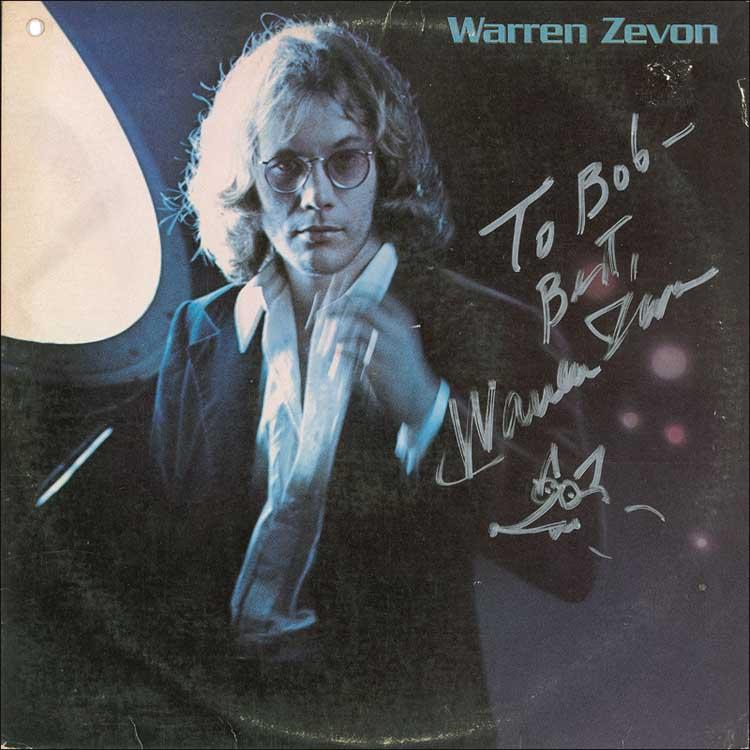 Self-titled album signed and inscribed on the front cover in silver ink, “To Bob—Best, Warren Zevon,” adding a small werewolf sketch under his signature. Punch hole to top left, and scattered light surface marks and dings, otherwise fine condition. The record is not included. RRAuction COA.