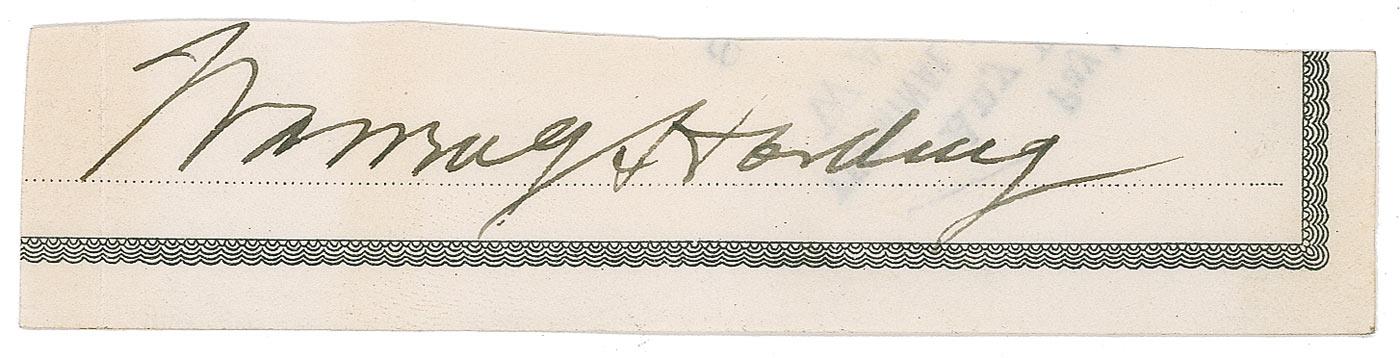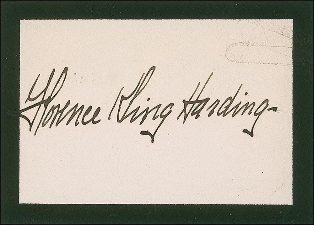 Ink signature, “Warren G. Harding,” on an off-white 4.5 x 1 slip clipped from a check; and an ink signature, “Florence Kling Harding,” on an off-white 3.25 x 2.5 black-bordered visiting card. Paperclip impressions to edge of Florence’s signature, and a vertical fold to left side of Warren’s slip, otherwise fine condition.