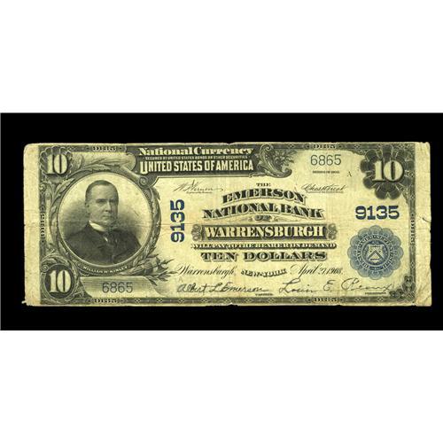 <B>Warrensburgh, NY</B></I> - $10 1902 Plain Back Fr. 626 <B>The Emerson NB</B></I> Ch. # 9135<BR>A more than acceptable example from one of New York's scarcer private name banks. We note no offerings of any kind from here since we sold the Sabis collection in May of 2003. <B>Fine,</B></I> with a small edge split more than offset by the delicate signature of the bank's namesake Albert L. Emerson as Cashier.