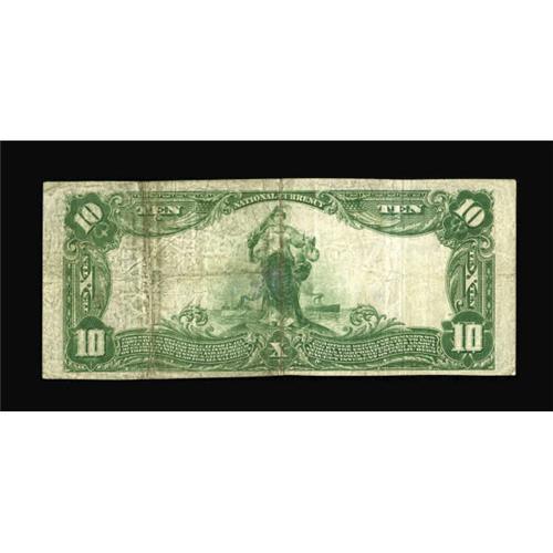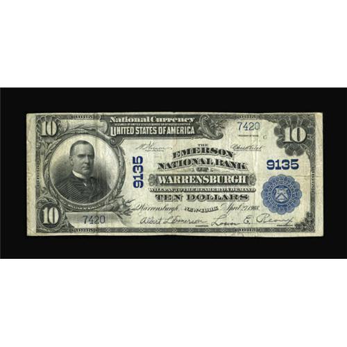 <B>Warrensburgh, NY</B></I> - $10 1902 Plain Back Fr. 626 <B>The Emerson NB</B></I> Ch. # 9135<BR> A nice example from one of New York's scarcer private name banks. <B>Fine, </B></I>with the signature of Albert L. Emerson as Cashier. For those wondering why the namesake of the bank occupied the position of Cashier rather than President, up through the 1930's the Cashier was often the officer who actually ran the bank, while the President, in many cases, occupied an honorific office but did little actual work directing the day to day operation of the bank. <BR><I>From The Thomas A. Bergin Collection</B></I><BR><BR><b>Shipping:</b> Coins & Currency (<a target="_blank" href="http://www.heritageauctions.com/common/shipping.php">view shipping information</a>)