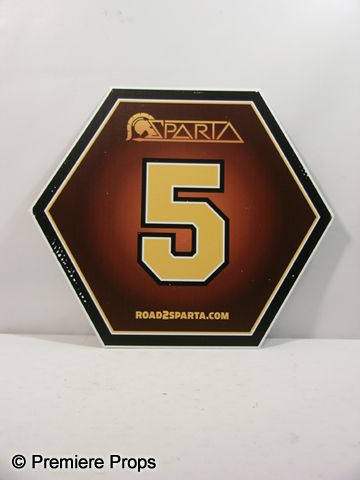 From 2011's 'Warrior.' This is a ring girl 'round card' used during the fight scenes. The prop is a red and orange colored, hexagon shaped card with painted 'Sparta' and 'Round 5' logos, and 'Road2sparta.com' logo affixed on the bottom. (measures approx. 21" x 24")