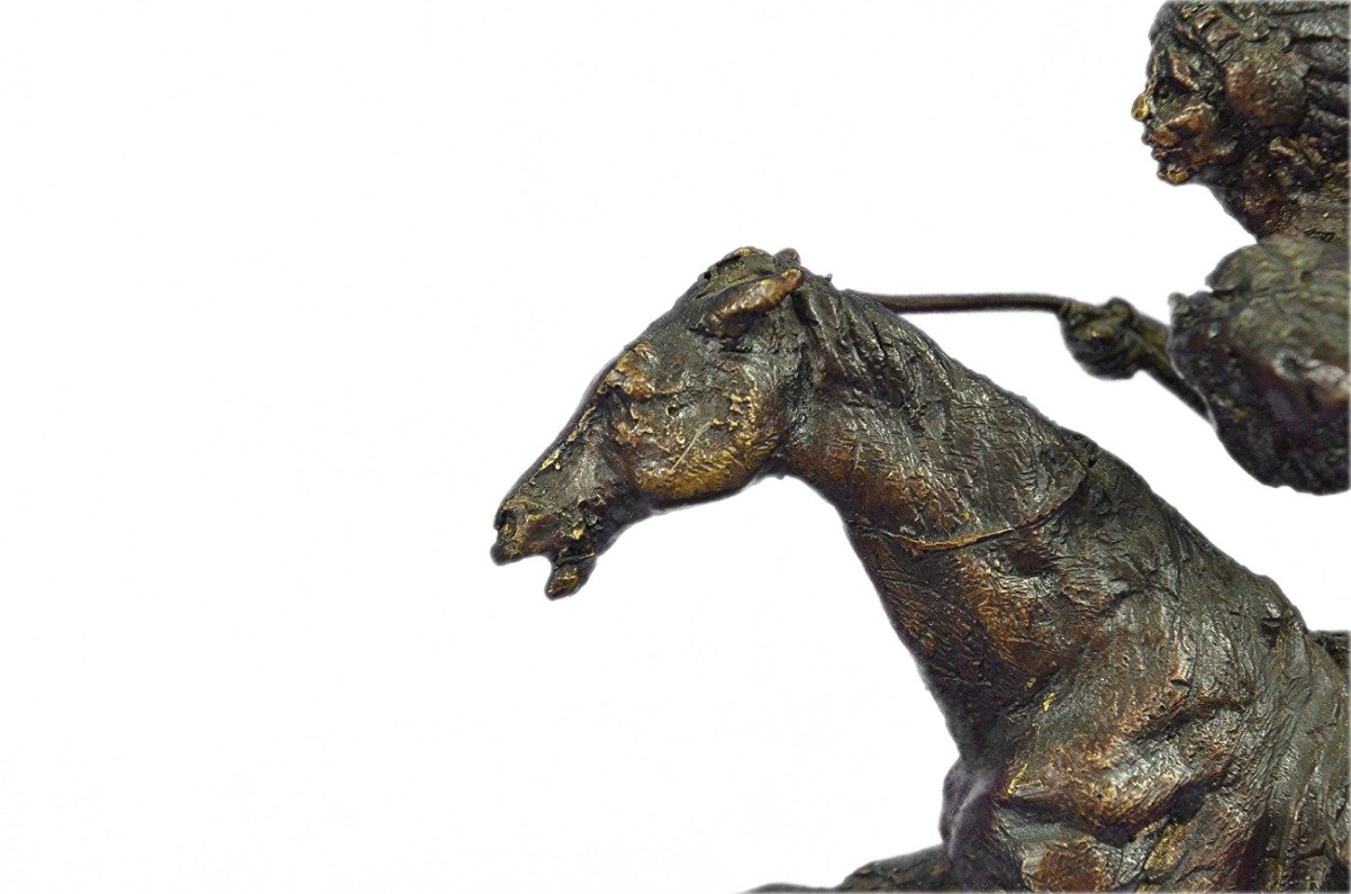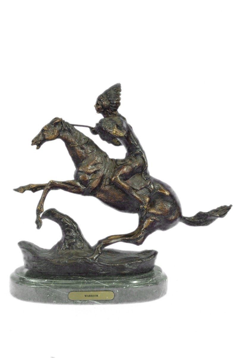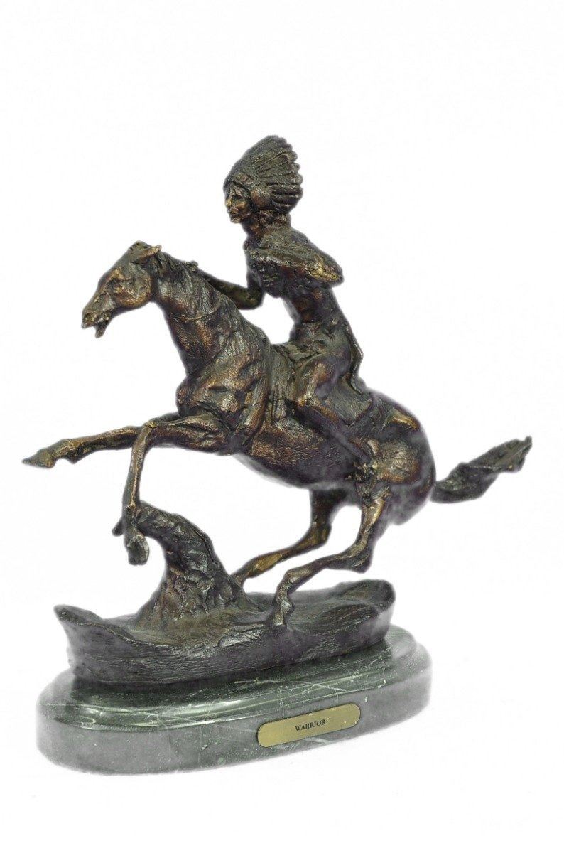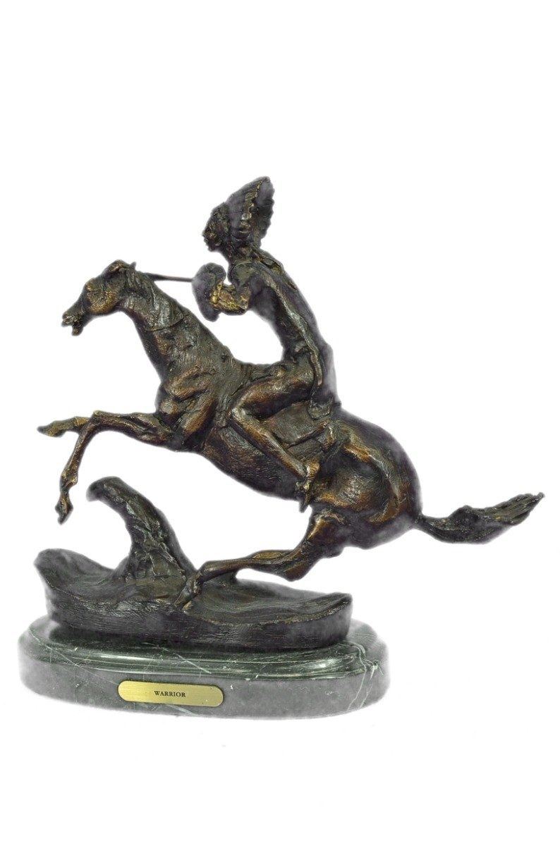 This is a very interesting sculpture of a Native American chief. He sits on his trusted horse and wanders the land, holding a spear and prepared for any potential threats. He has triumphed over many different travelers and settlers trying to take over his peoples land and has a keep-sake from each of them. On his head he wears traditional feather hat helmet and on the side of the hat he has a braid coming down. Around his waist is a typical skirt cloth to cover up his private area. he horse he rides is a stallion and has full tack on. This is a beautifully detailed historical rendition of a native in this time and is sure to be enjoyed by any viewer for many years to come. Handmade of 100% bronze and cast using the ancient Lost Wax Method. A two tone brown patina is used, and its atop a black marble base. Bronze Dimensions with Marble Base: Height 9 X Width 10 inches. Weight: 7 LBS. Inventory: 39-631024593