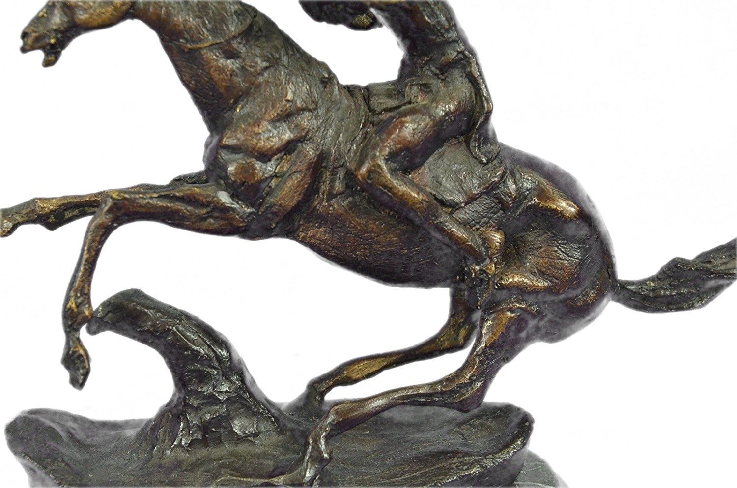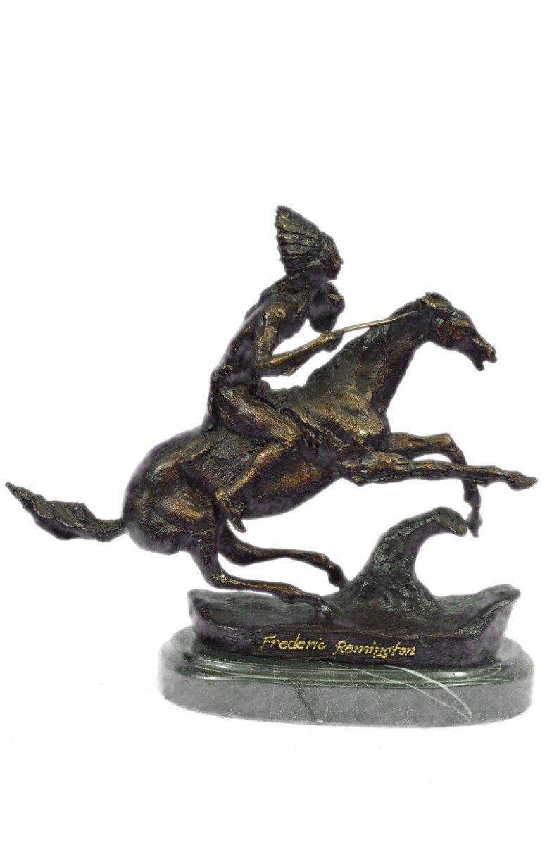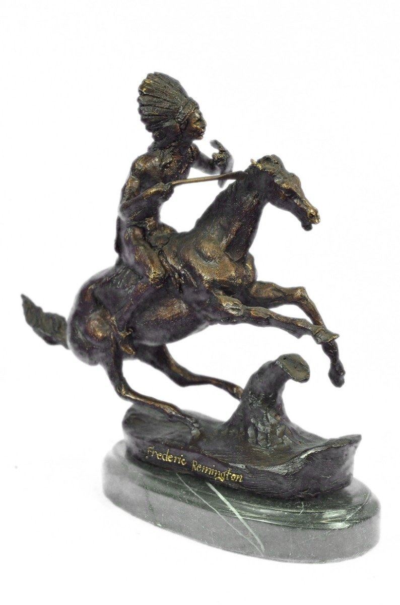 This is a very interesting sculpture of a Native American chief. He sits on his trusted horse and wanders the land, holding a spear and prepared for any potential threats. He has triumphed over many different travelers and settlers trying to take over his peoples land and has a keep-sake from each of them. On his head he wears traditional feather hat helmet and on the side of the hat he has a braid coming down. Around his waist is a typical skirt cloth to cover up his private area. he horse he rides is a stallion and has full tack on. This is a beautifully detailed historical rendition of a native in this time and is sure to be enjoyed by any viewer for many years to come. Handmade of 100% bronze and cast using the ancient Lost Wax Method. A two tone brown patina is used, and its atop a black marble base. Bronze Dimensions with Marble Base: Height 9 X Width 10 inches. Weight: 7 LBS. Inventory: 39-631024593