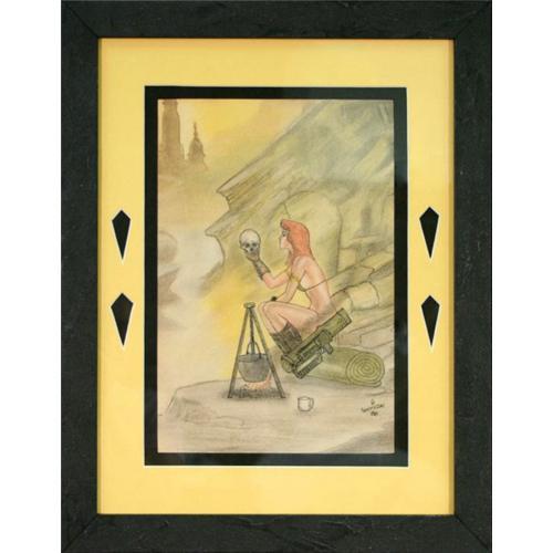 The words that perfectly describe this ink and pastel drawing entitled ?Warrior?, done by the imaginative artist Senviczki, are unique and one of a kind. Done in 1988, this amazing piece definitely embodies the spirit and style of fantasy art. Tall towers can be seen in the distance as the soft mist curls around them and helps to create a marvelous sense of atmospheric perspective. There is a young woman with flaming red hair sitting by a fire and gazing at a skull, which she holds captive in her right hand. She is deep in serious contemplation, surrounded by the meager possessions of her campsite. Perhaps this matters little when all the important things for survival are there, especially the enormous gun propped up by her side. Although this female warrior is scantily clad, a fantasy stereotype that she helps validate, she is clearly on a mission that she aims to complete. There is a pencil under drawing that was then outlined in parts with pen and ink, like many illustrations, and colored with pastels. The pastels are used expertly, blended together to create a hazy glow of mystery. This work of art is enhanced even more through the use of diamond shaped specialty cuts on the soft yellow top mat, which allows the bottom black mat to show through. These diamond cuts are unique and carefully handcrafted by our expert framer, adding that special touch to the piece. It is framed in a black wood frame that has been glazed over with a textured layer imitating a stucco finish; rough, ...