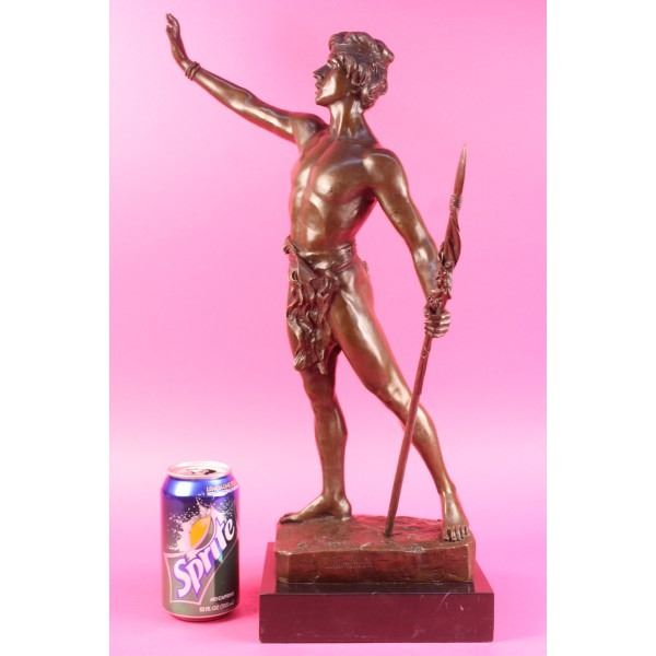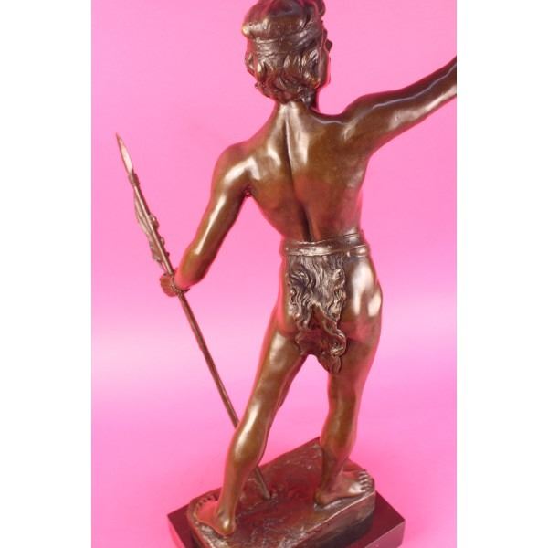 They will wait for the moment when he signals them to charge forward, risking it all for their land, women and children. He clutches a spear in his hand and wears nothing but a loin cloth around his waist. He is lean and muscular. His strong legs have great speed and he is agile on his toes. He will need the skills he has obtained over the years to win this fight and live to see another. This sculpture was carefully detailed. Please Notice his brow arching with determination and his lips parting to deliver the order. This brown patina sculpture was cast using the lost wax method and mounted on a black marble base. Bronze dimensions with marble base: Height 21 X Width 14 inches. Weight: 20 lbs. Please Note: This is a reproduction bronze sculpture from the original molded and signed. This featured bronze sculpture is a recast after the original, and has been done recently. This 100% bronze sculpture is an abstract piece certain to be a conversation piece.Please Note: This is a reproduction bronze sculpture from the original molded and signed. This featured bronze sculpture is a recast after the original, and has been done recently. This 100% bronze sculpture is an abstract piece certain to be a conversation piece.