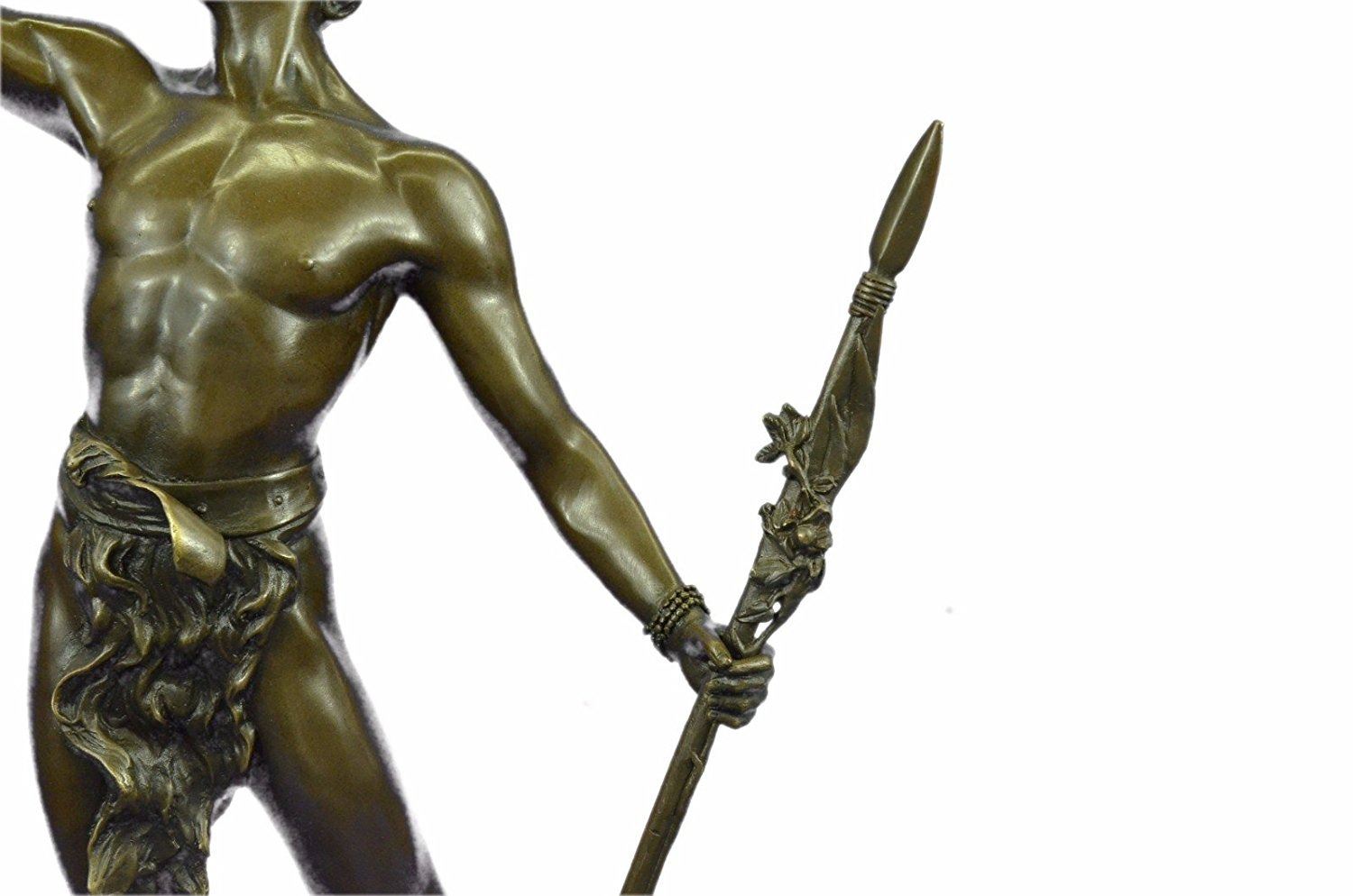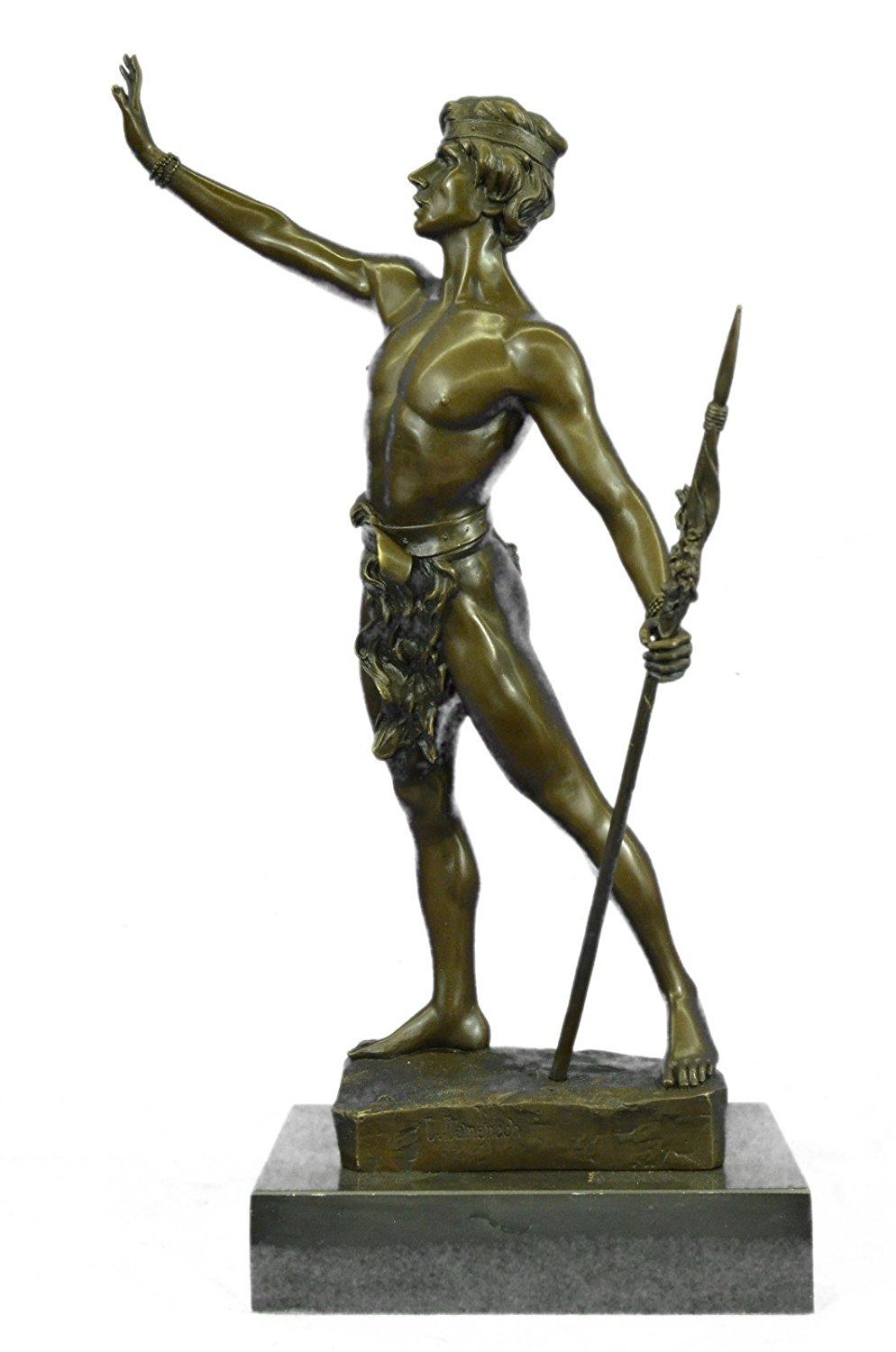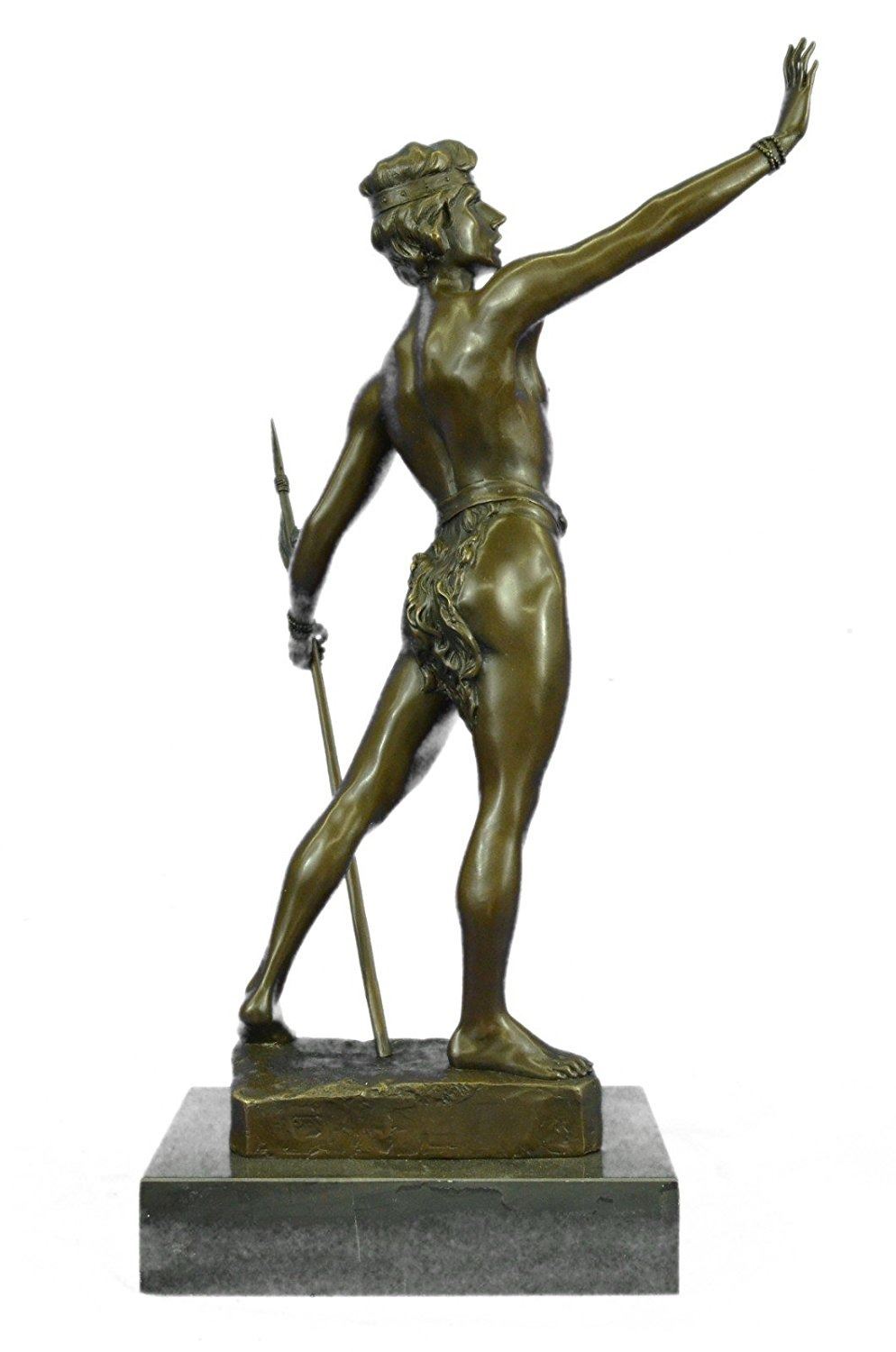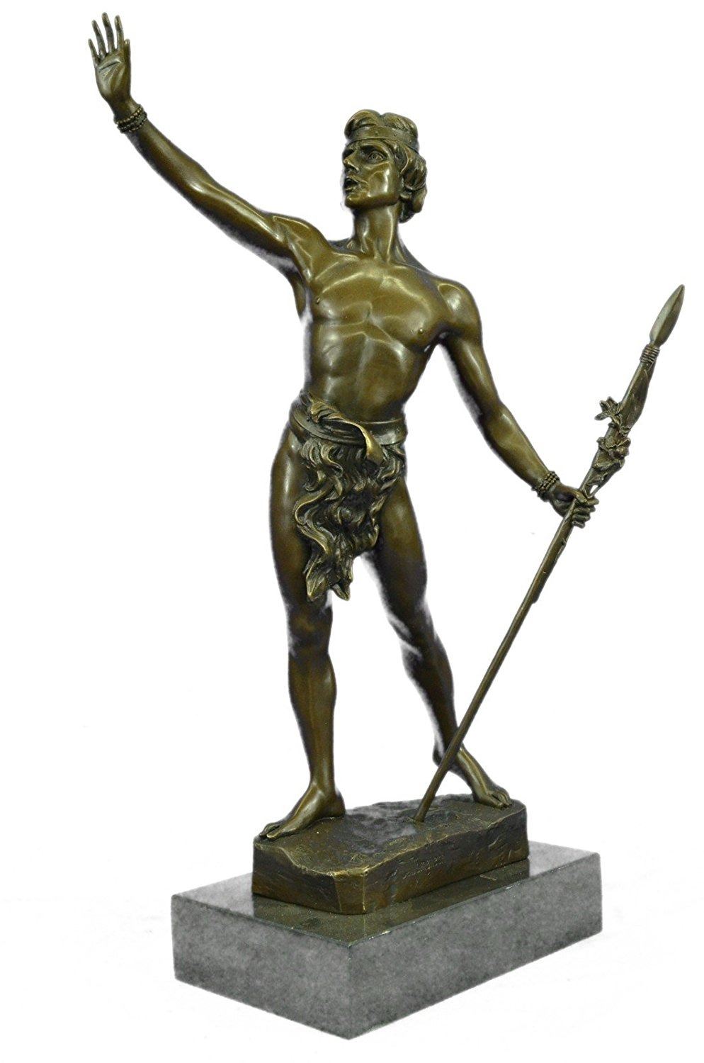 Hand to silence their battle cries. He will give the order to attack.They will wait for the moment when he signals them to charge forward, risking it all for their land, women and children. He clutches a spear in his hand and wears nothing but a loin cloth around his waist. No heavy clothes to weigh him down. No clunky weapons to maneuver. He is lean and muscular. His strong legs have great speed and he is agile on his toes. He will need the skills he has obtained over the years to win this fight and live to see another. This handmade sculpture was carefully detailed. Notice his brow arching with determination and his lips parting to deliver the order. 100% bronze, this brown patina sculpture was cast using the Lost Wax Method and mounted on a black marble base. Bronze Dimensions with Marble Base: Height 21 X Width 14 inches. Weight: 20 LBS. Inventory: 15B4416151