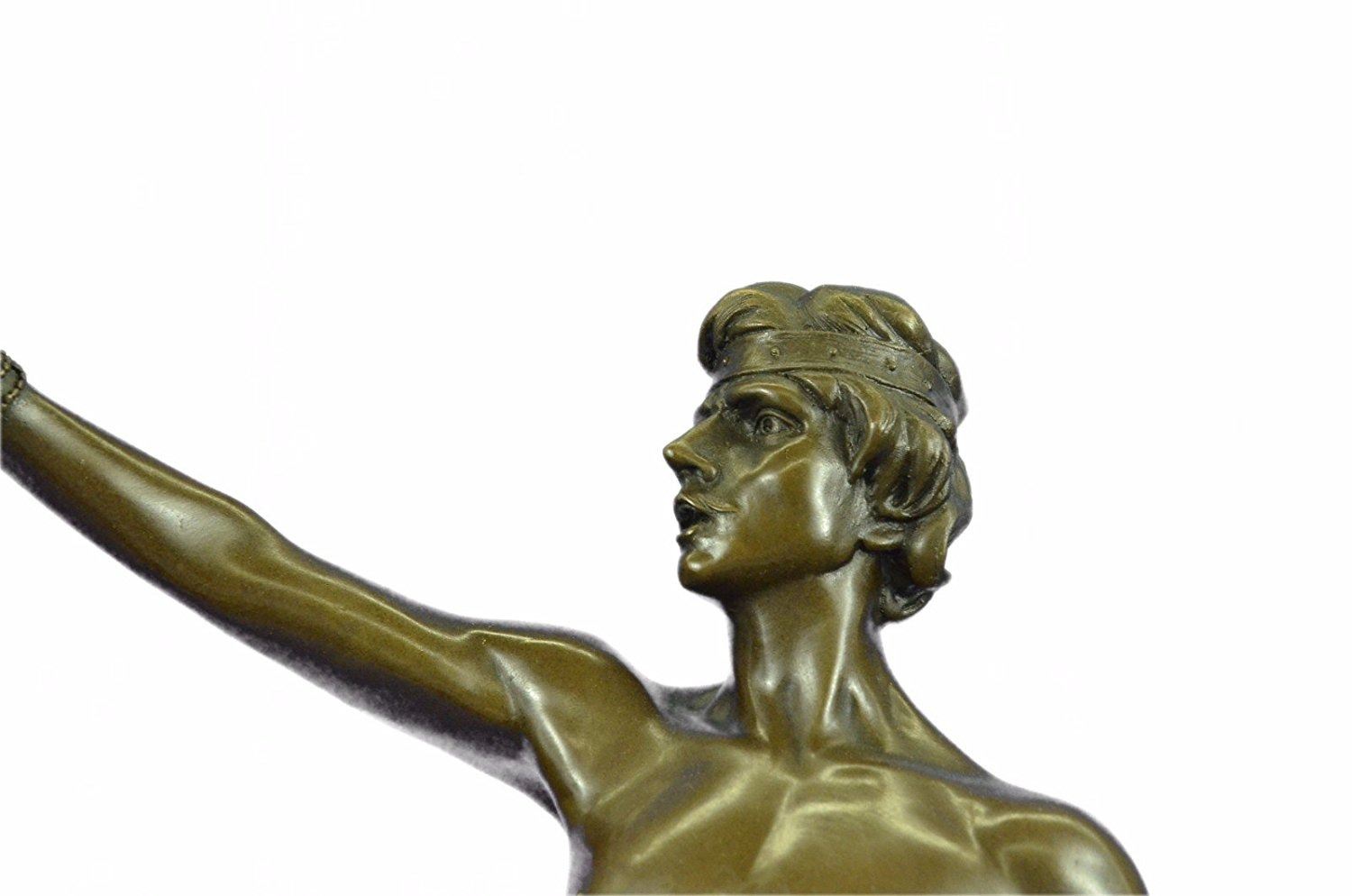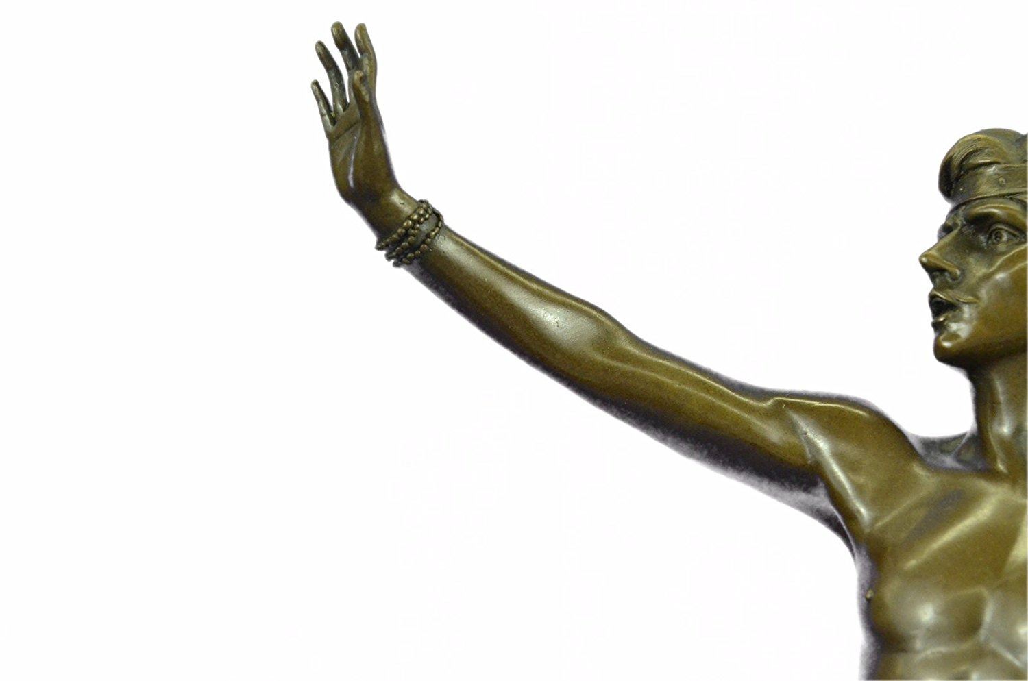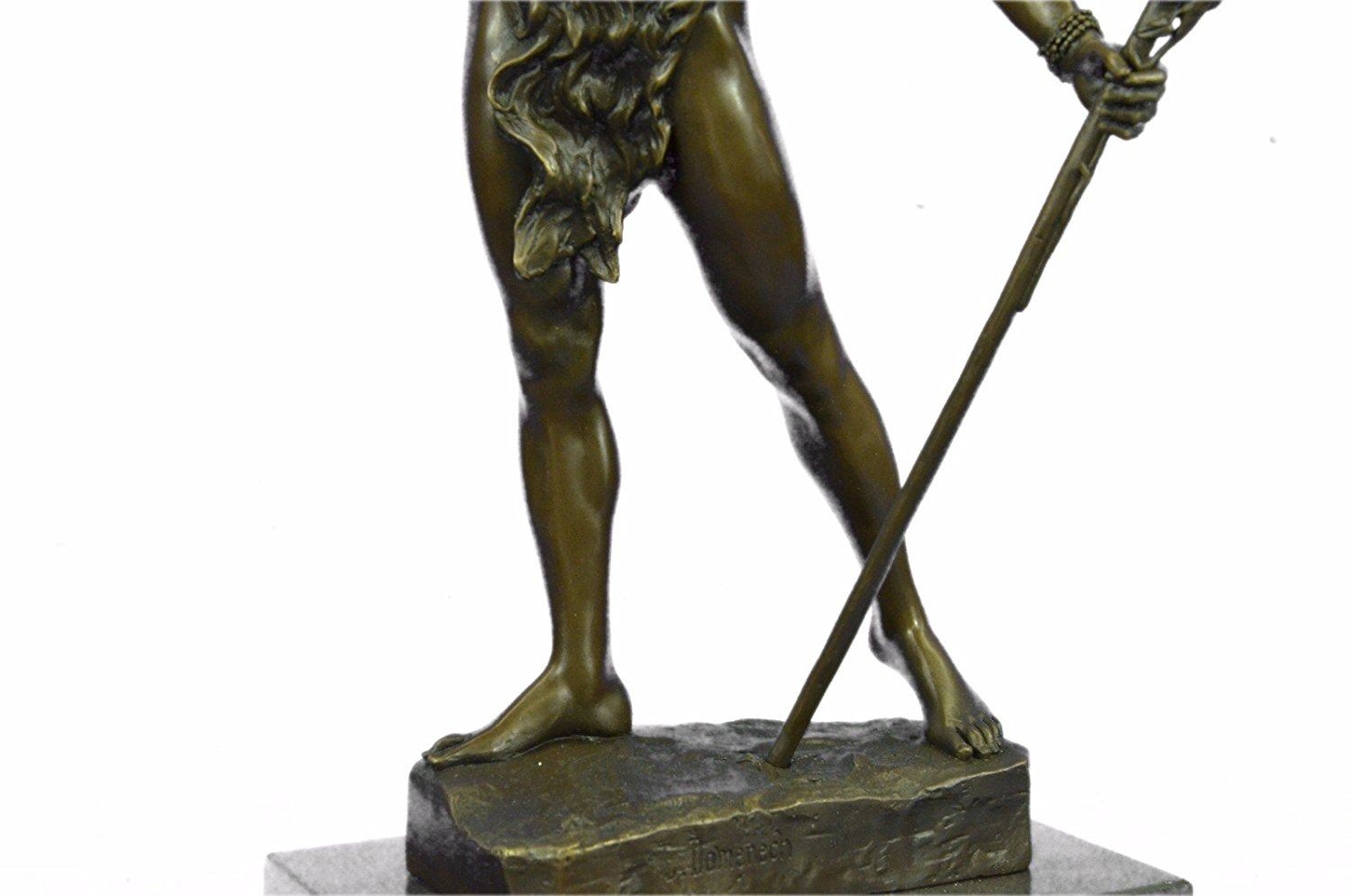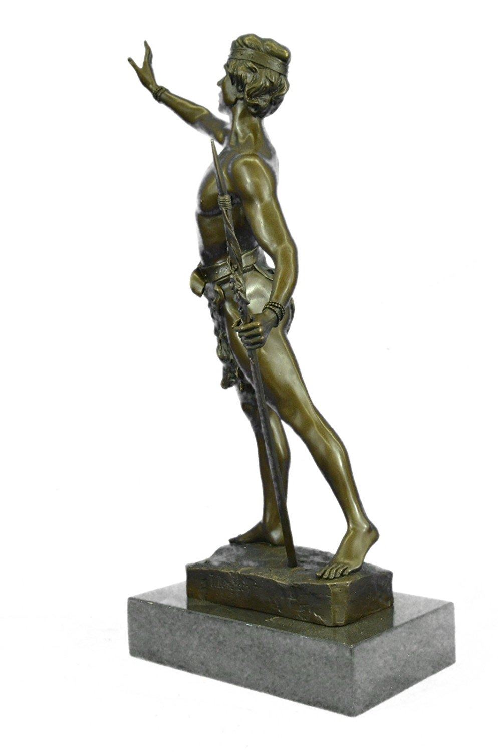 Hand to silence their battle cries. He will give the order to attack.They will wait for the moment when he signals them to charge forward, risking it all for their land, women and children. He clutches a spear in his hand and wears nothing but a loin cloth around his waist. No heavy clothes to weigh him down. No clunky weapons to maneuver. He is lean and muscular. His strong legs have great speed and he is agile on his toes. He will need the skills he has obtained over the years to win this fight and live to see another. This handmade sculpture was carefully detailed. Notice his brow arching with determination and his lips parting to deliver the order. 100% bronze, this brown patina sculpture was cast using the Lost Wax Method and mounted on a black marble base. Bronze Dimensions with Marble Base: Height 21 X Width 14 inches. Weight: 20 LBS. Inventory: 15B4416151
