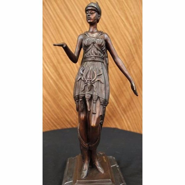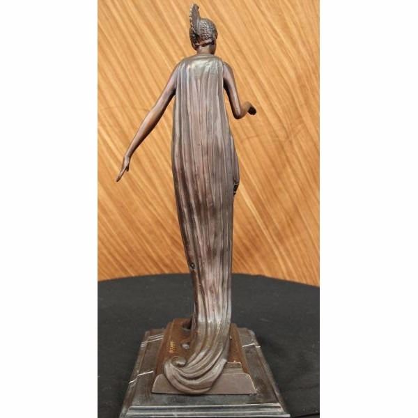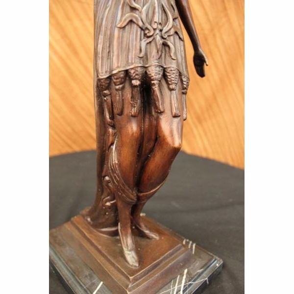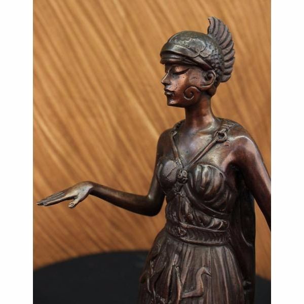An Roman Female warrior stands boldly, staring her enemy in the eye. She comes from a supernatural world and fights the immortal creatures that ravage it. She is Dressed in an exquisite dress . She wears a suit that clings to her curves. She is 100% bronze and handmade, this Brown patina sculpture was cast using the Lost Wax Method and mounted on a marble base. Bronze Dimensions with Marble Base: Height 19 X Width 10. Weight: 14 LBS.