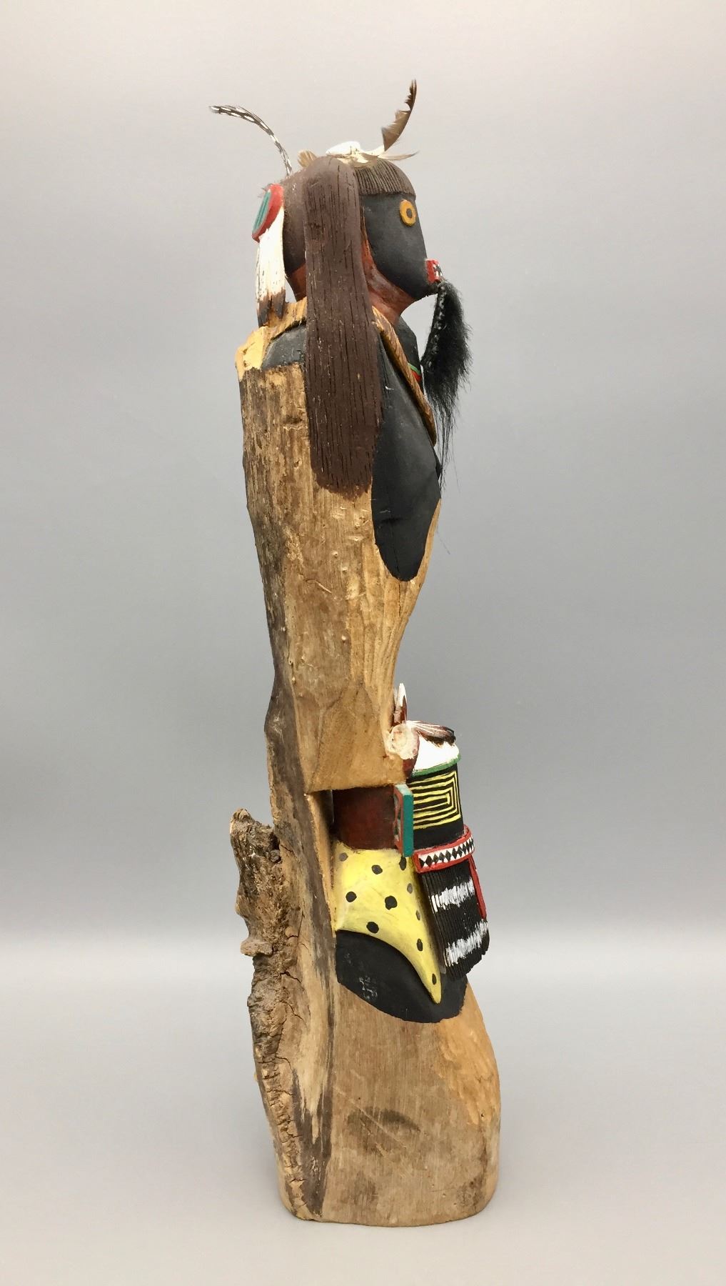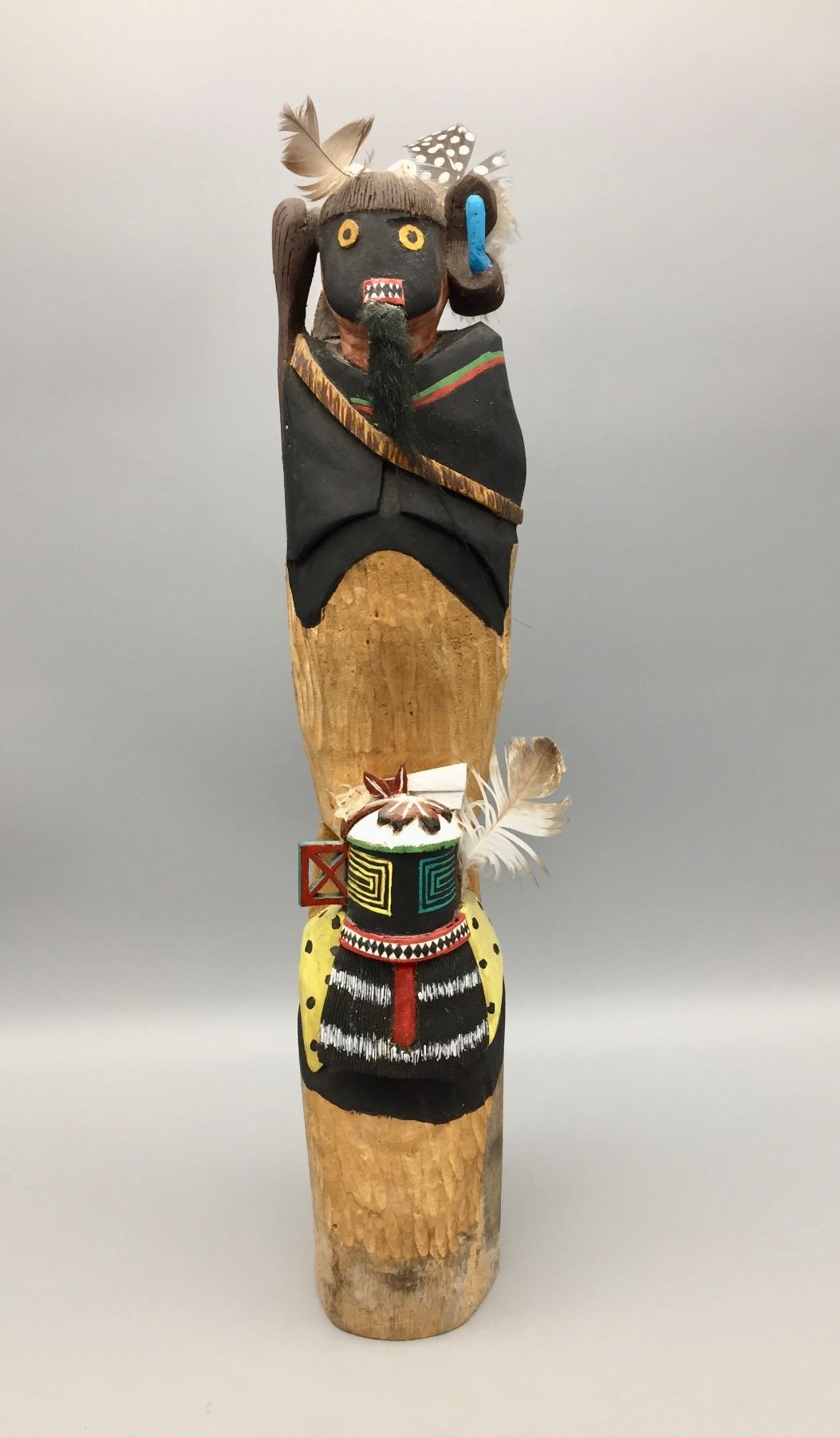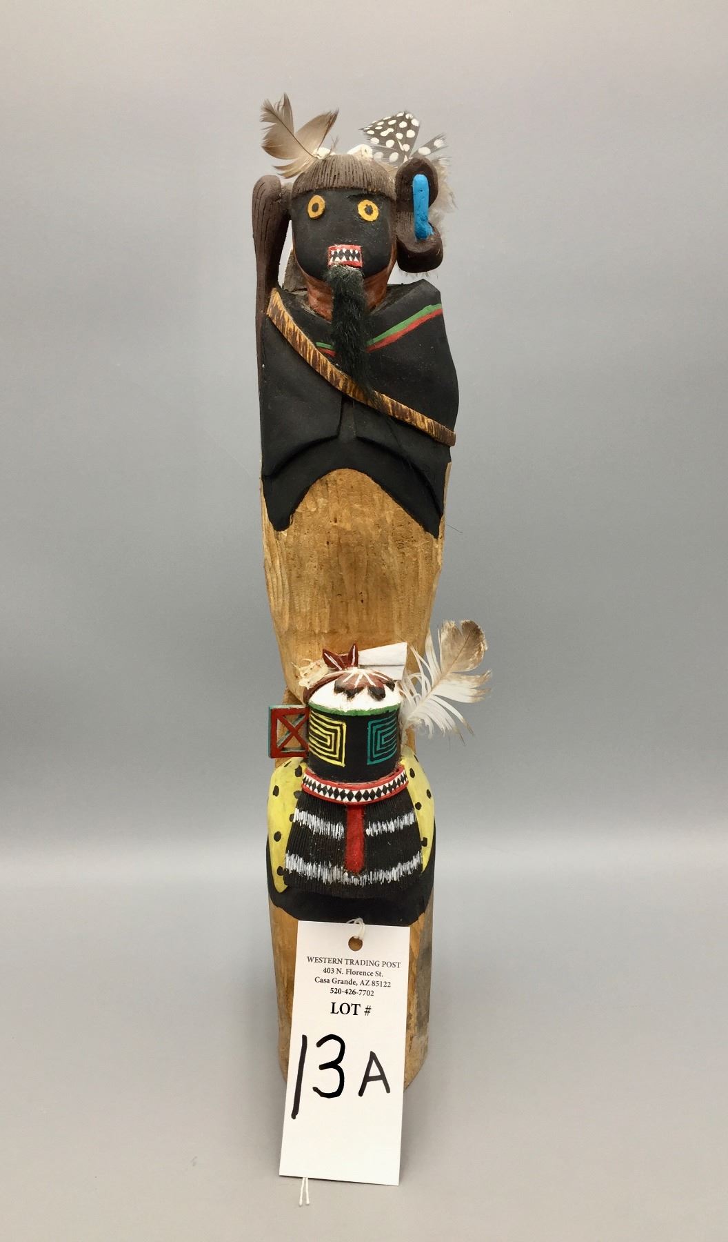 Description: Featured in this lot is a hand carved, wooden Kachina. This detailed carving represents a warrior and warrior maiden. Maker: Signed, Glenn and Hopi. Approx. Age: Circa 1980s. Size: Measures approximately 3” wide x 17” tall at tallest point. Condition: Good for its age, normal wear expected. Please look closely at the pictures - they are an important part of our description. Shipping: There will be a $10 handling / packaging fee for shipping this lot. The actual cost of postage will be added on top of that.
