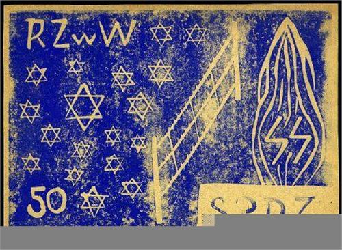 Warsaw Ghetto Set. Complete set of six notes, made by the Jewish postal government in Warsaw during World War II. Probably the only currency produced in the Ghetto without Nazi approval. Notes, crudely made, appear unused. 5, 10, 15, 20, 25, and 50 Groszy denominations, sizes 11/4 x 2 to 41/4 x 6, in varying shades of blue on light tan paper, decorated with six-pointed stars. The blue ink is variable in darkness, the 50 Groszy note being unusually dark with the stars occupying most of the space, and a flame obscuring the "SS" motif. Choice and very rare.