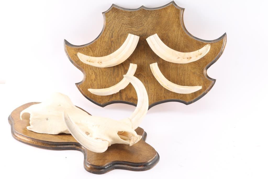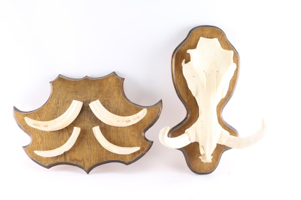 Partial skull plaque measures: 19"H X 13"W X 6.5"D. Tusk plaque measures: 19"W X 12"H