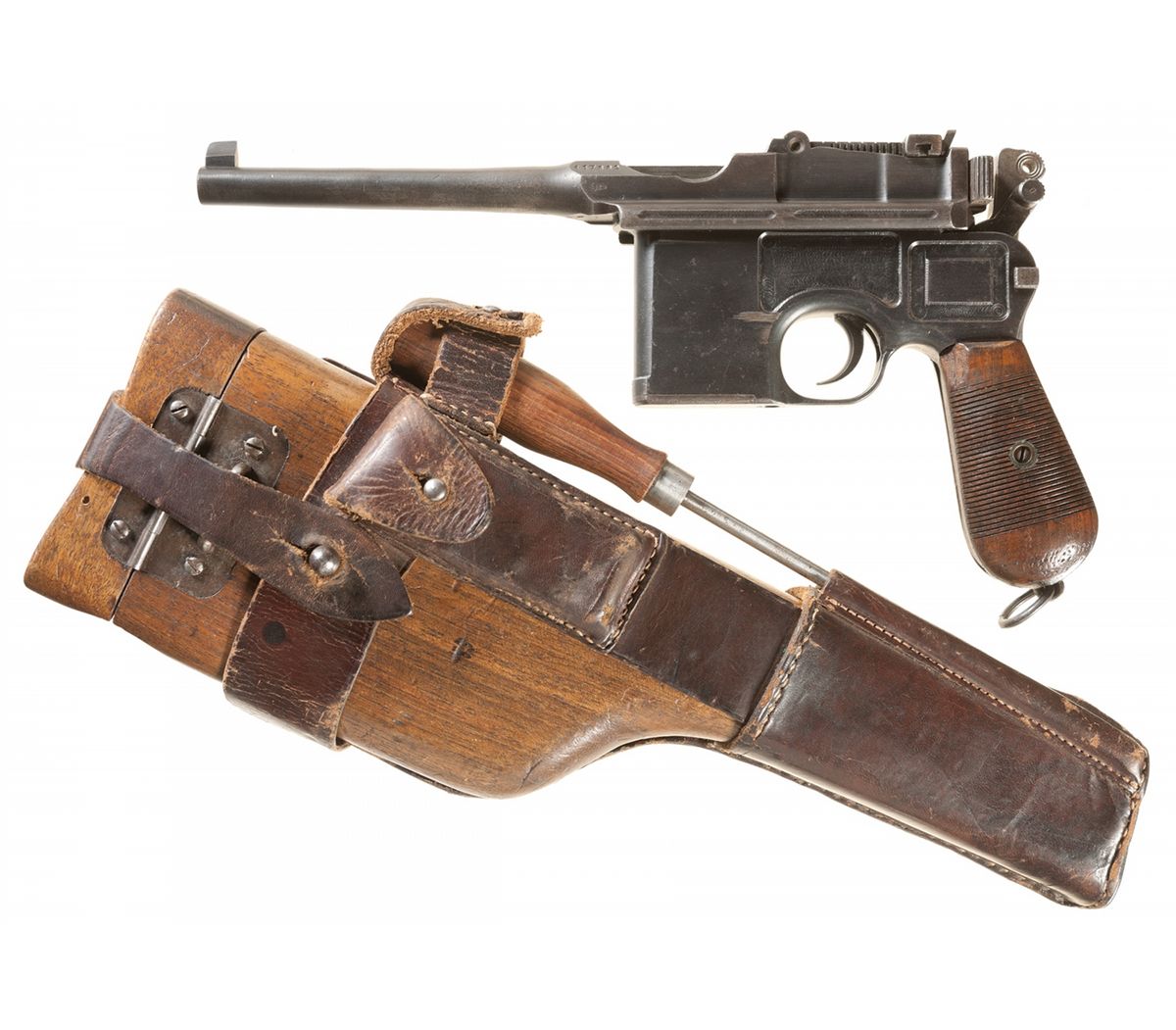 Manufactured in 1917. With stock/holster, leather stock carrier, cleaning rod and 1 extra magazine spring.