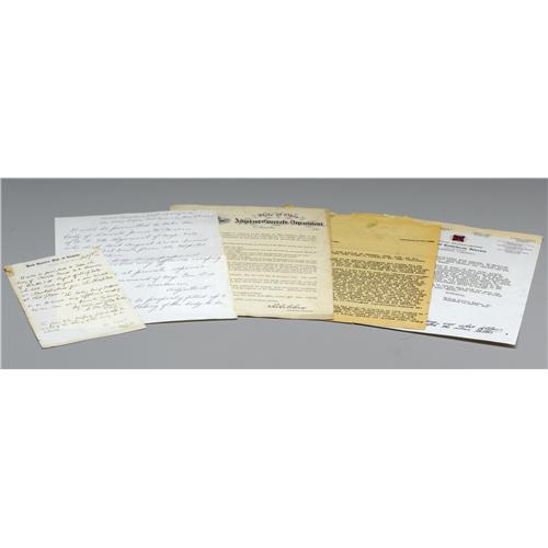<B>Wartime Union Letter and Post-War Ephemera.</B></I> A diverse lot consisting of the following items: ALS, one page, 5" x 8", Fort Monroe, Virginia, November 9, 1862. An official letter penned on 7th Army Corps stationery in which burial of the body of one Private James McGovern, Co. H, 9th Massachusetts Volunteers is discussed. Stains, very good condition; Pre-printed letter, one page, 8.5" x 11", on stationery of the Ohio Adjutant General's Office, circa 1880s. Complete with an engraved vignette of a Union soldier, this letter announces the publication of a Roster of Ohio Soldiers. Stains, very good condition; Typed Letter, two pages, 8.5" x 11", February 17, 1935, no place, to General R. A. Sneed, Oklahoma City. This anonymous letter discusses a "<I>flag controversy</B></I>" at a reunion in which the Grand Army of the Republic apparently did not approve of Confederate flags flying. Paper loss to top edge, browning, else good condition; Sons of Confederate Veterans Letter, one page, 8.5" x 11, ca. 1950s. A form letter promoting a book on the Stonewall Brigade. Browning to top, else fine condition.<BR><BR><b>Shipping:</b> Small Flat (<a target="_blank" href="http://www.heritageauctions.com/common/shipping.php">view shipping information</a>)