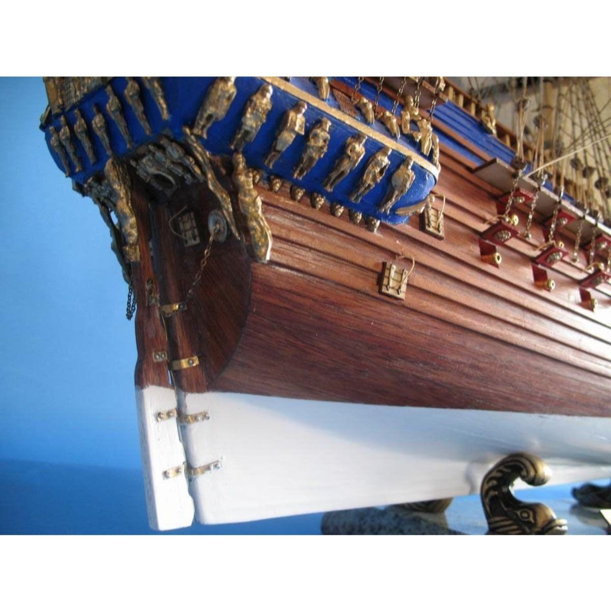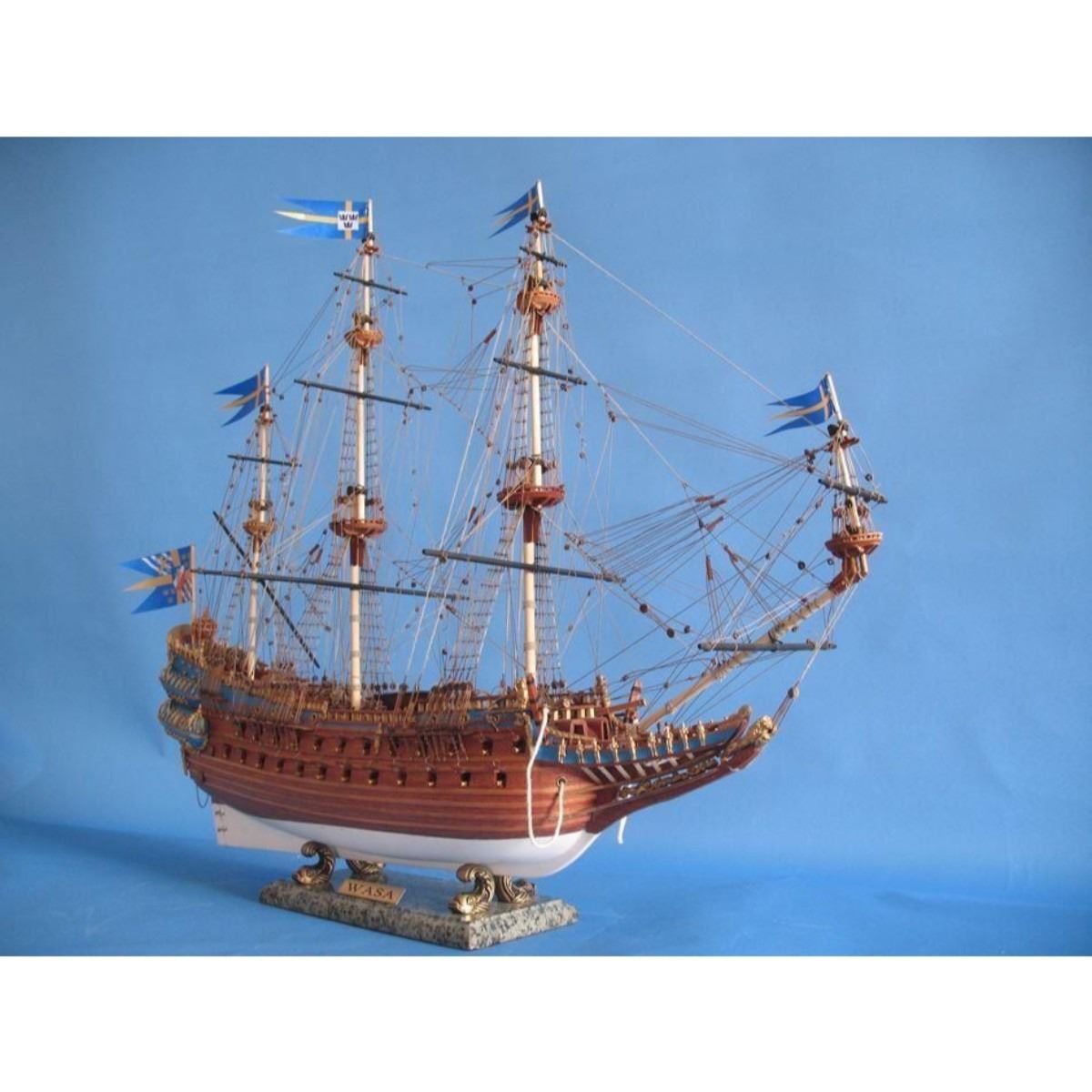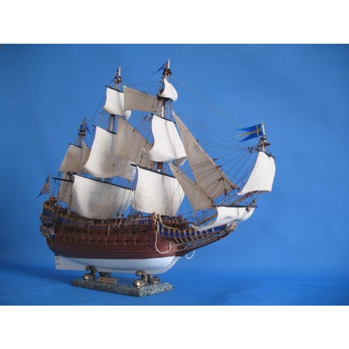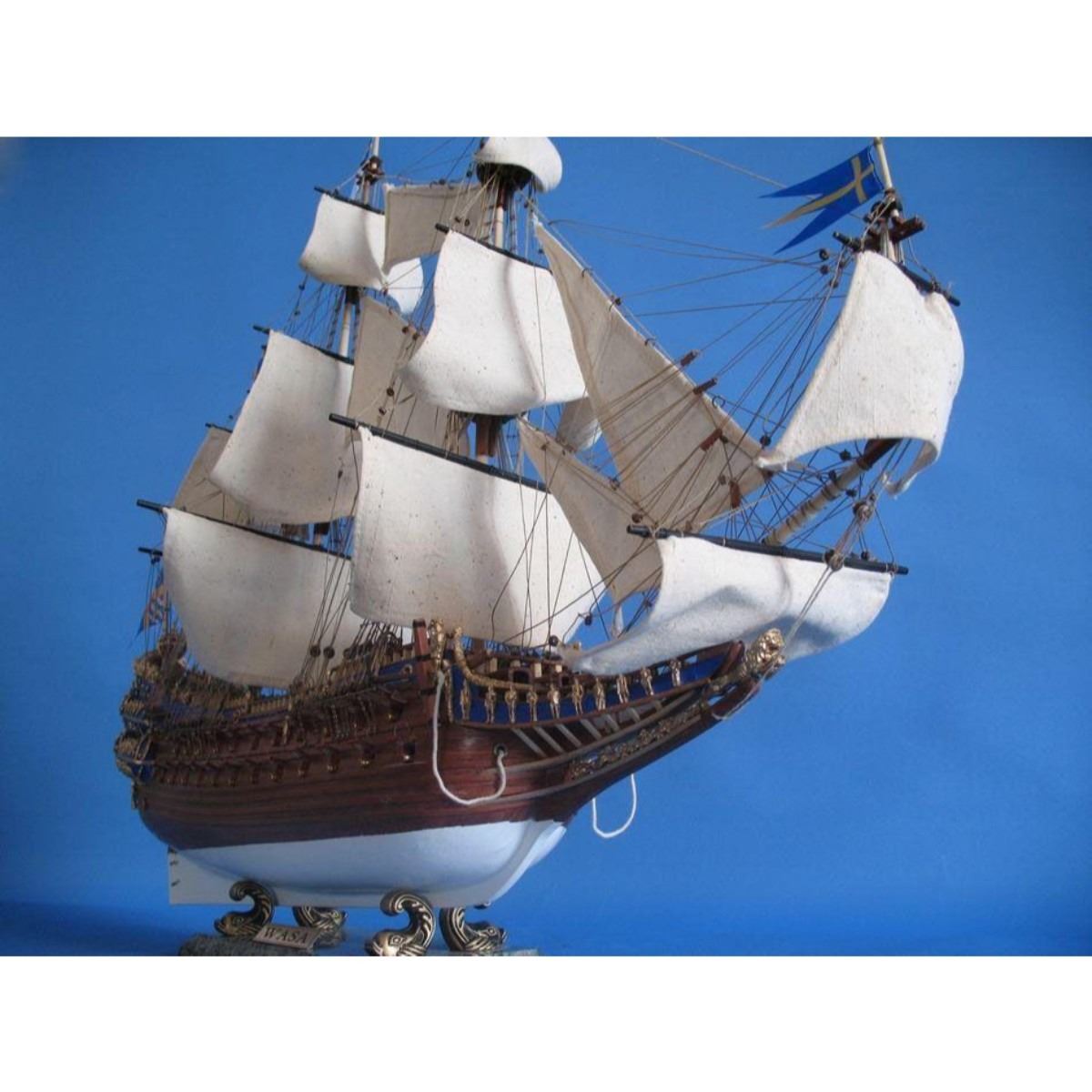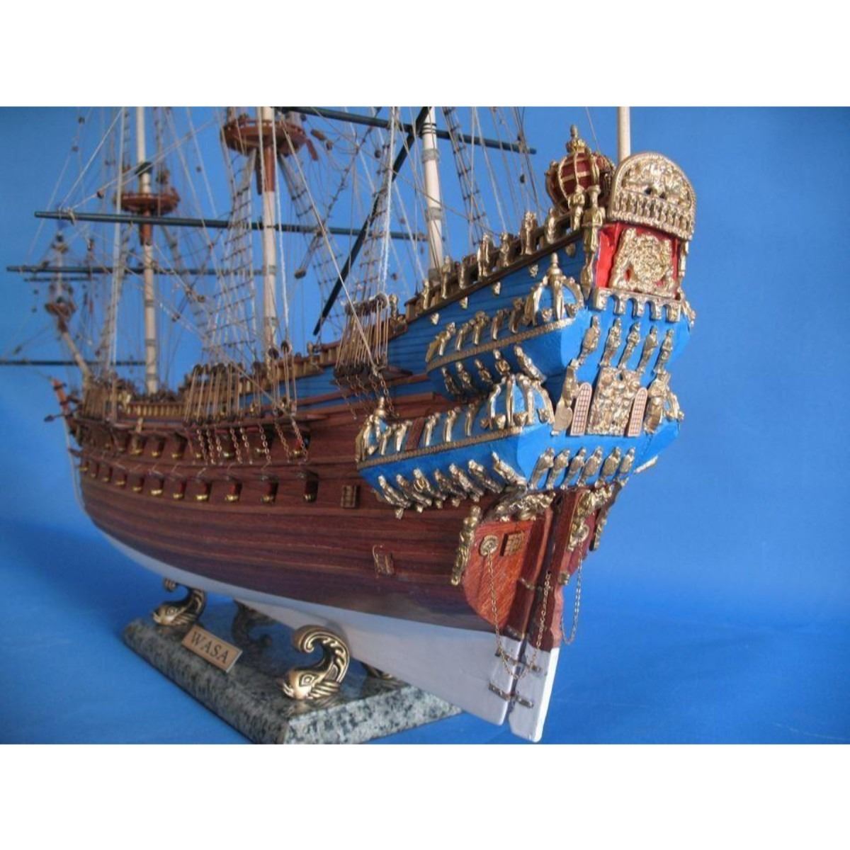 Wasa Limited Tall Model Ship 32" SOLD FULLY ASSEMBLED Ready for Immediate Display - Not a Model Ship kit Historically accurate features bedeck these museum-quality Limited Edition scale replica tall ship models of the Wasa (or Vasa), which are built with the finest craftsmanship and attention to detail. As the grandest warship in the fleet of Swedish King Gustavus Adolphus and built according to his personal specifications, this fighting tall ship of the line salvaged and now displayed as a modern museum ship occupies a distinguished place in Swedish naval history. Now her Limited Edition tall ships model may similarly occupy a proud position in your office, home or meeting room from which to display her exquisite beauty. 32" Long x 9" Wide x 28" High (1:85 scale) Built from scratch over hundreds of hours by master artisans Accurate scale replica tall ship models of the Wasa Museum Quality features not available in other tall ship models under $3,000 or any kit Over 1,000 individual hull pieces, with more than 100 carved adornments Detailed scrollwork, carvings, beakhead and railed quarter balconies with hand-painting Historically correct sails Extensive rigging with hundreds of single, double and triple deadeyes Realistic lifeboats with oars and numerous other deck features Numerous additional deck details such as cannon balls, barrels, rope coils, cleats, etc. Individual wooden planks used in plank-on-frame hull construction High quality woods include walnut, cherry, birch, teak and rosewood Gun ports actually cut into the hull Amazing Details, including: Planked deck with nail holes Authentic scale lifeboats with oars Curved wooden staircases ascend aftcastle and forecastle Numerous individual cannon arm the ship Solid brass cannon fire through actual gun ports Cannonball racks, buckets, barrels, rope coils and other nautical items adorn decks Lattice grates, rudder chains, wooden ladders and planked steps Metal anchors on thick hawsers Masterfully stitched, heavy canvas sails hold shape and do not wrinkle Taut rigging with varied thread gauge and color Cloth flags fly from masts and rigging Limited production run Wooden display base features four arched dolphins Pictured with marble base (available for purchase) Extensive research of original plans, historical drawings and paintings as well as actual photographs ensures the highest possible accuracy Technical Specifications True Museum Quality! This 4 foot long Wasa model stands out above all others in beauty and craftsmanship. Add this impressive historic ship to your life today! Fully Assembled Only 1 available!!