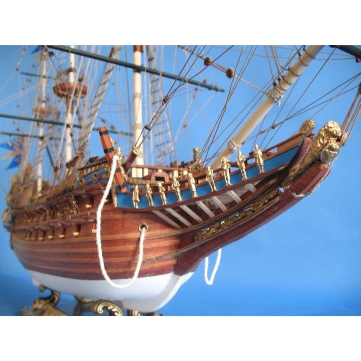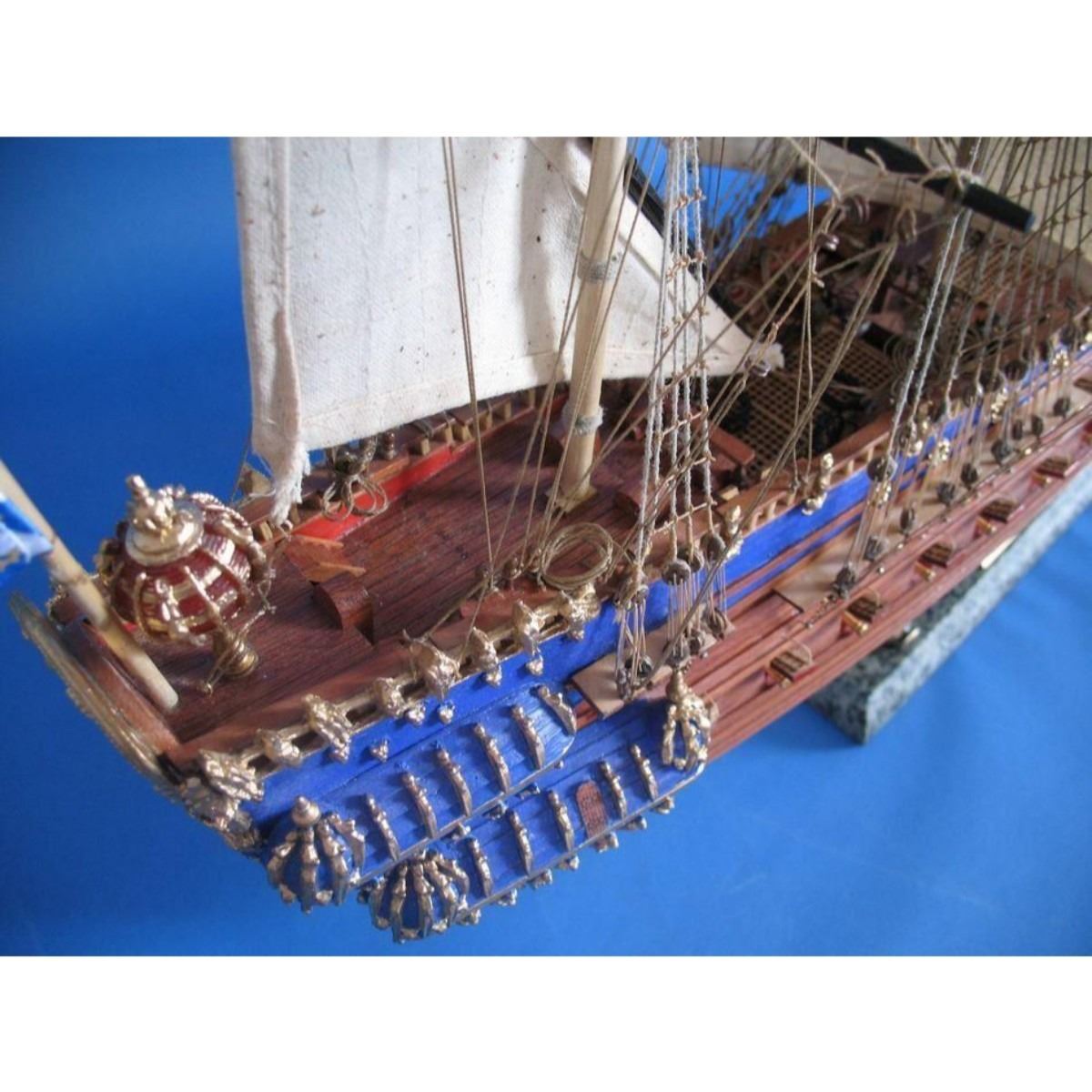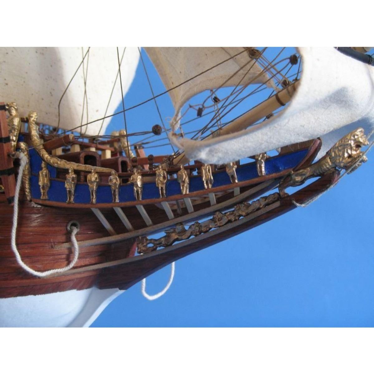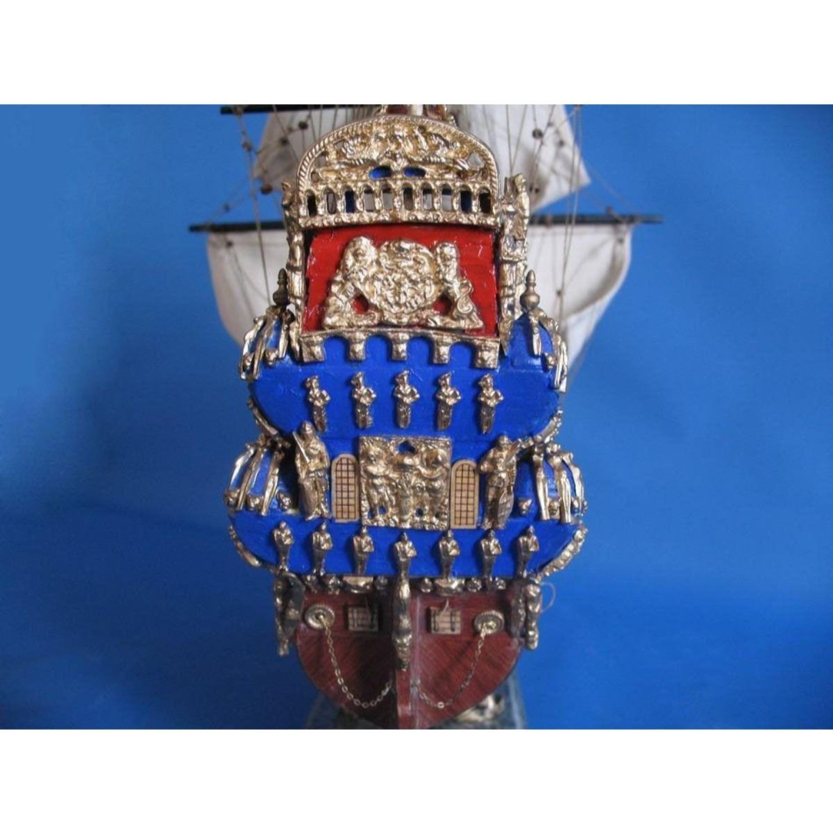 Wasa Limited Tall Model Ship 32" SOLD FULLY ASSEMBLED Ready for Immediate Display - Not a Model Ship kit Historically accurate features bedeck these museum-quality Limited Edition scale replica tall ship models of the Wasa (or Vasa), which are built with the finest craftsmanship and attention to detail. As the grandest warship in the fleet of Swedish King Gustavus Adolphus and built according to his personal specifications, this fighting tall ship of the line salvaged and now displayed as a modern museum ship occupies a distinguished place in Swedish naval history. Now her Limited Edition tall ships model may similarly occupy a proud position in your office, home or meeting room from which to display her exquisite beauty. 32" Long x 9" Wide x 28" High (1:85 scale) Built from scratch over hundreds of hours by master artisans Accurate scale replica tall ship models of the Wasa Museum Quality features not available in other tall ship models under $3,000 or any kit Over 1,000 individual hull pieces, with more than 100 carved adornments Detailed scrollwork, carvings, beakhead and railed quarter balconies with hand-painting Historically correct sails Extensive rigging with hundreds of single, double and triple deadeyes Realistic lifeboats with oars and numerous other deck features Numerous additional deck details such as cannon balls, barrels, rope coils, cleats, etc. Individual wooden planks used in plank-on-frame hull construction High quality woods include walnut, cherry, birch, teak and rosewood Gun ports actually cut into the hull Amazing Details, including: Planked deck with nail holes Authentic scale lifeboats with oars Curved wooden staircases ascend aftcastle and forecastle Numerous individual cannon arm the ship Solid brass cannon fire through actual gun ports Cannonball racks, buckets, barrels, rope coils and other nautical items adorn decks Lattice grates, rudder chains, wooden ladders and planked steps Metal anchors on thick hawsers Masterfully stitched, heavy canvas sails hold shape and do not wrinkle Taut rigging with varied thread gauge and color Cloth flags fly from masts and rigging Limited production run Wooden display base features four arched dolphins Pictured with marble base (available for purchase) Extensive research of original plans, historical drawings and paintings as well as actual photographs ensures the highest possible accuracy Technical Specifications True Museum Quality! This 4 foot long Wasa model stands out above all others in beauty and craftsmanship. Add this impressive historic ship to your life today! Fully Assembled Only 1 available!!