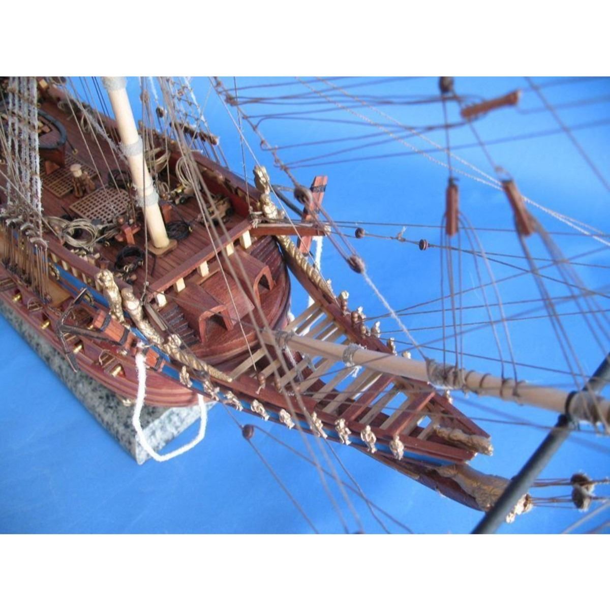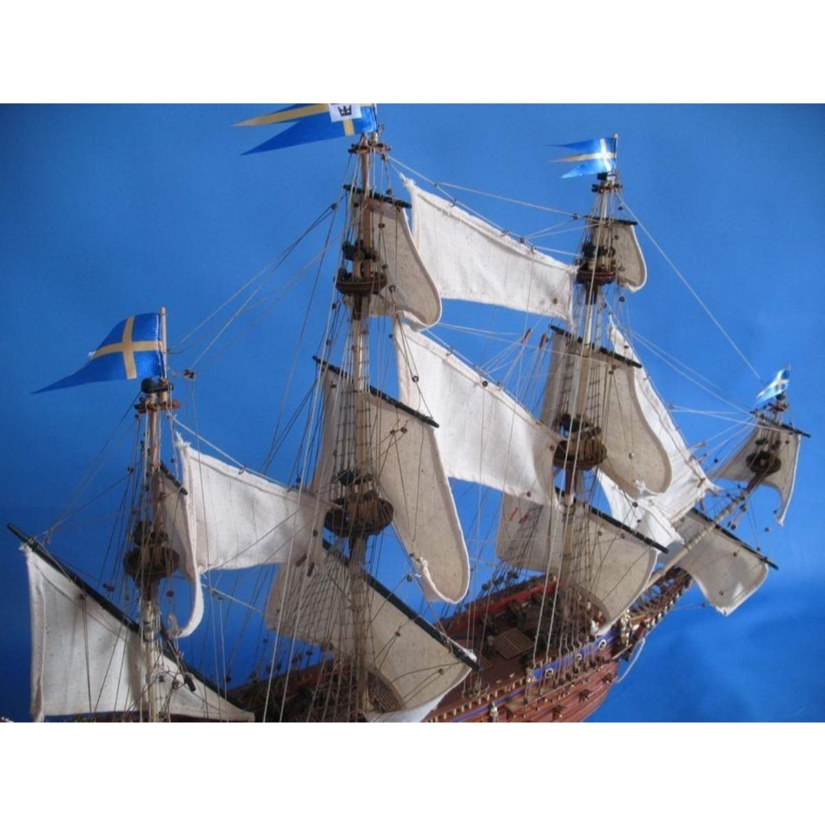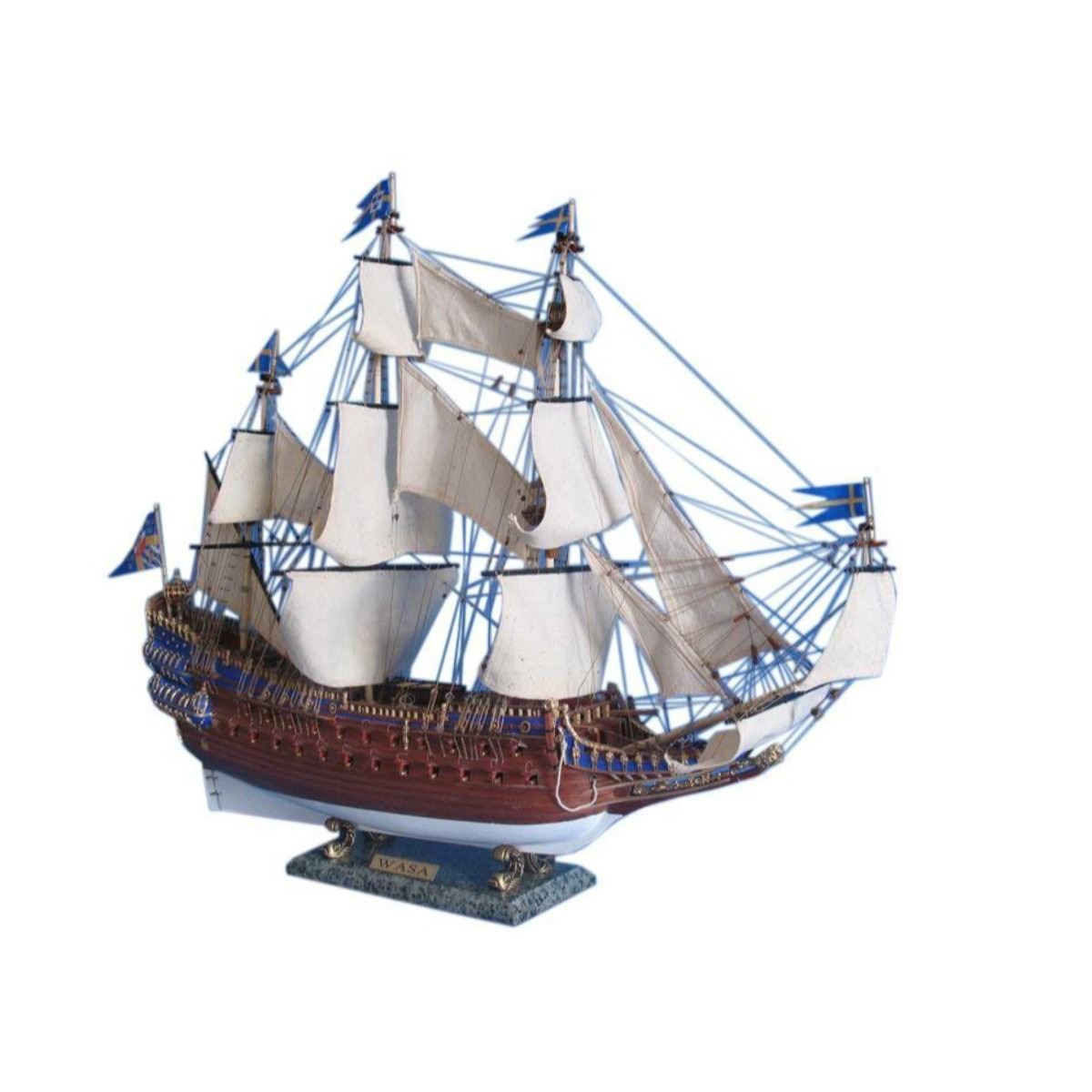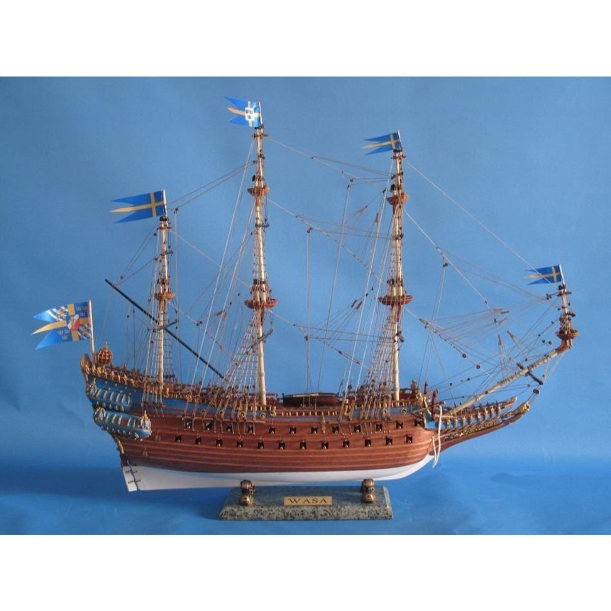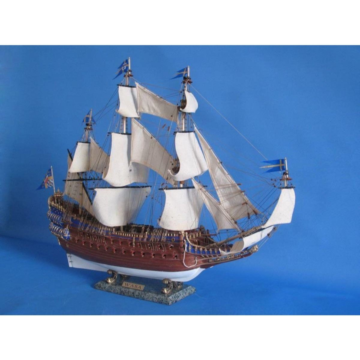 Wasa Limited Tall Model Ship 32" SOLD FULLY ASSEMBLED Ready for Immediate Display - Not a Model Ship kit Historically accurate features bedeck these museum-quality Limited Edition scale replica tall ship models of the Wasa (or Vasa), which are built with the finest craftsmanship and attention to detail. As the grandest warship in the fleet of Swedish King Gustavus Adolphus and built according to his personal specifications, this fighting tall ship of the line salvaged and now displayed as a modern museum ship occupies a distinguished place in Swedish naval history. Now her Limited Edition tall ships model may similarly occupy a proud position in your office, home or meeting room from which to display her exquisite beauty. 32" Long x 9" Wide x 28" High (1:85 scale) Built from scratch over hundreds of hours by master artisans Accurate scale replica tall ship models of the Wasa Museum Quality features not available in other tall ship models under $3,000 or any kit Over 1,000 individual hull pieces, with more than 100 carved adornments Detailed scrollwork, carvings, beakhead and railed quarter balconies with hand-painting Historically correct sails Extensive rigging with hundreds of single, double and triple deadeyes Realistic lifeboats with oars and numerous other deck features Numerous additional deck details such as cannon balls, barrels, rope coils, cleats, etc. Individual wooden planks used in plank-on-frame hull construction High quality woods include walnut, cherry, birch, teak and rosewood Gun ports actually cut into the hull Amazing Details, including: Planked deck with nail holes Authentic scale lifeboats with oars Curved wooden staircases ascend aftcastle and forecastle Numerous individual cannon arm the ship Solid brass cannon fire through actual gun ports Cannonball racks, buckets, barrels, rope coils and other nautical items adorn decks Lattice grates, rudder chains, wooden ladders and planked steps Metal anchors on thick hawsers Masterfully stitched, heavy canvas sails hold shape and do not wrinkle Taut rigging with varied thread gauge and color Cloth flags fly from masts and rigging Limited production run Wooden display base features four arched dolphins Pictured with marble base (available for purchase) Extensive research of original plans, historical drawings and paintings as well as actual photographs ensures the highest possible accuracy Technical Specifications True Museum Quality! This 4 foot long Wasa model stands out above all others in beauty and craftsmanship. Add this impressive historic ship to your life today! Fully Assembled Only 1 available!!