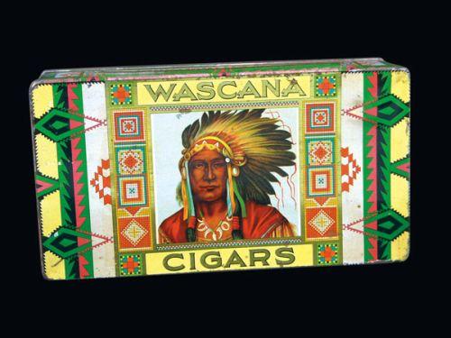 Wascana Cigars Tin Box. Killer Color and Graphics. Excellent condition. 8 1/2 X 2 1/2 X 4 1/2 inches.