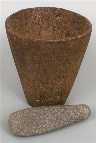 Wasco Burl Bowl with Original Pestle. Bowl is 8" x 7 ½”. Stone Pestle is 7 ½” long. Pre 1900. Excellent condition. (est $600-800).