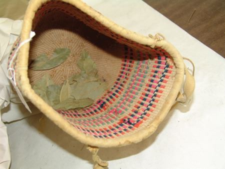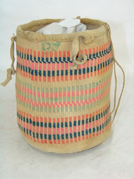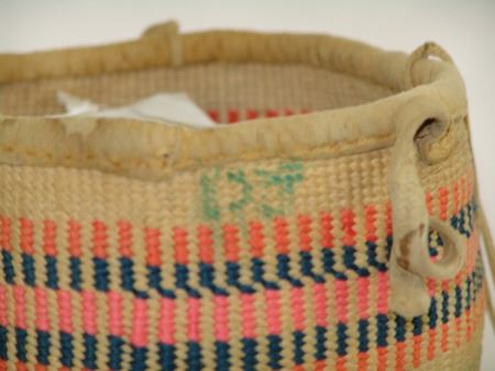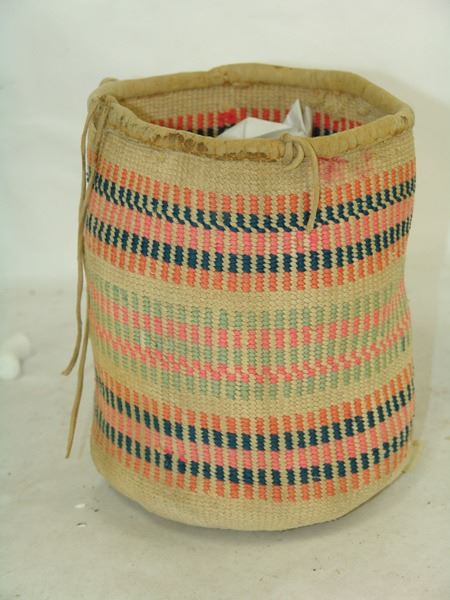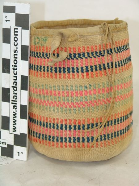Early/Mid 1900s, Wonderful woven corn husk and string cylindrical bag with buckskin trim and tracked color bands done in softened pastel colors. Very good condition. 9-1/4" x 8"